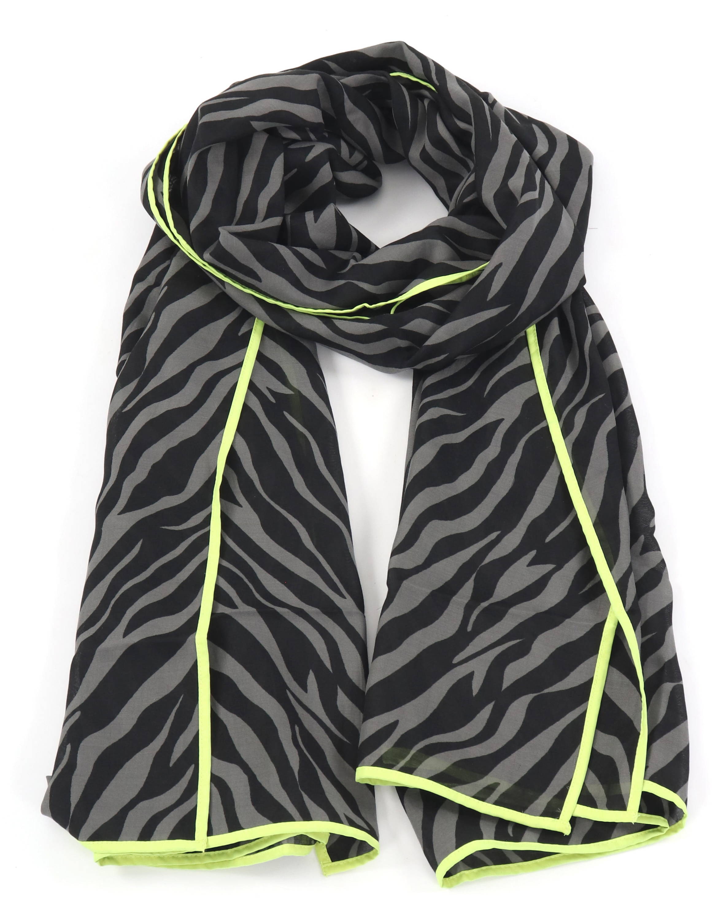 En tunn zebramönstrad lång halsduk med en neonfärgad kant.