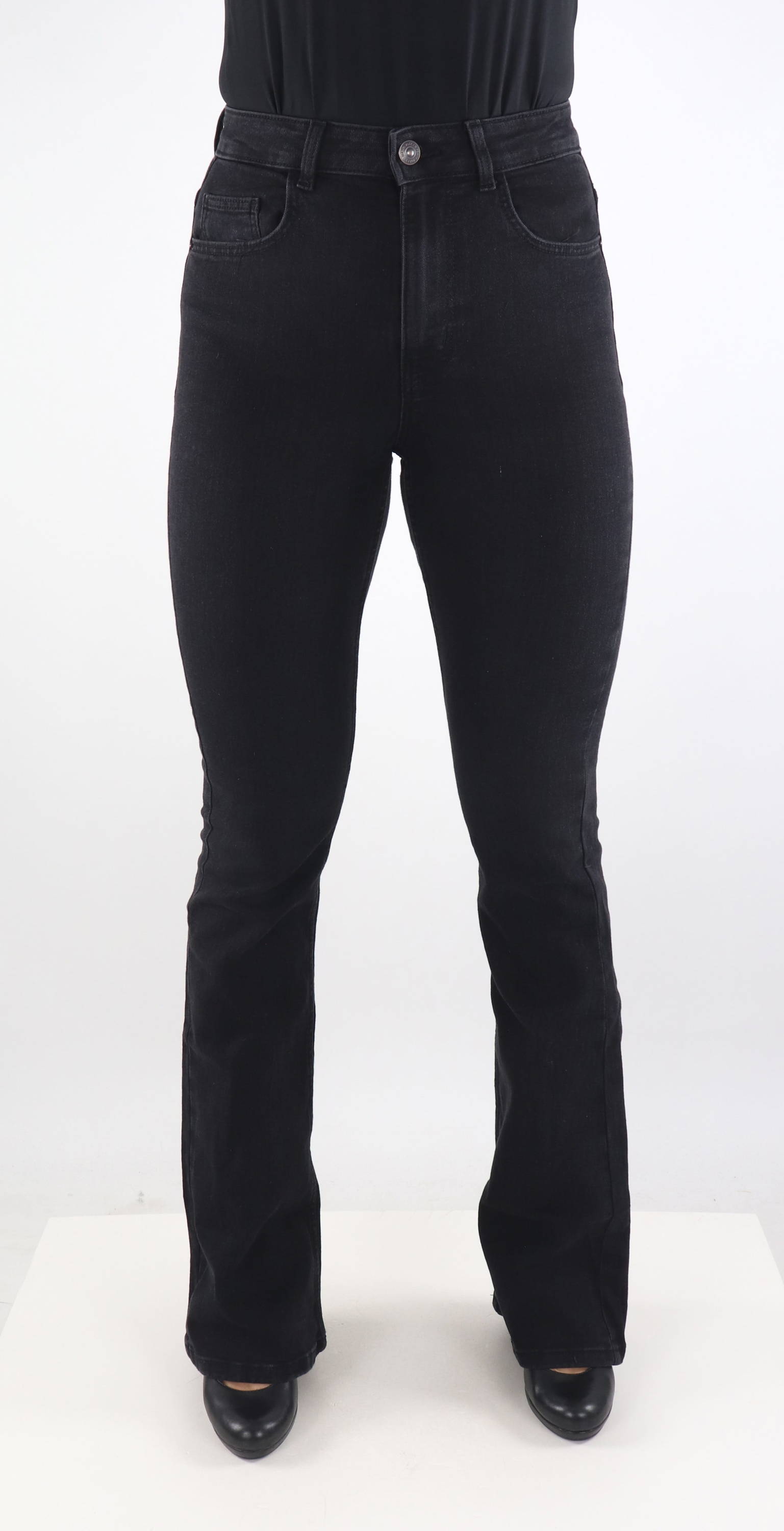 Jeans med hög midja och vidgade ben, modell med fem fickor.