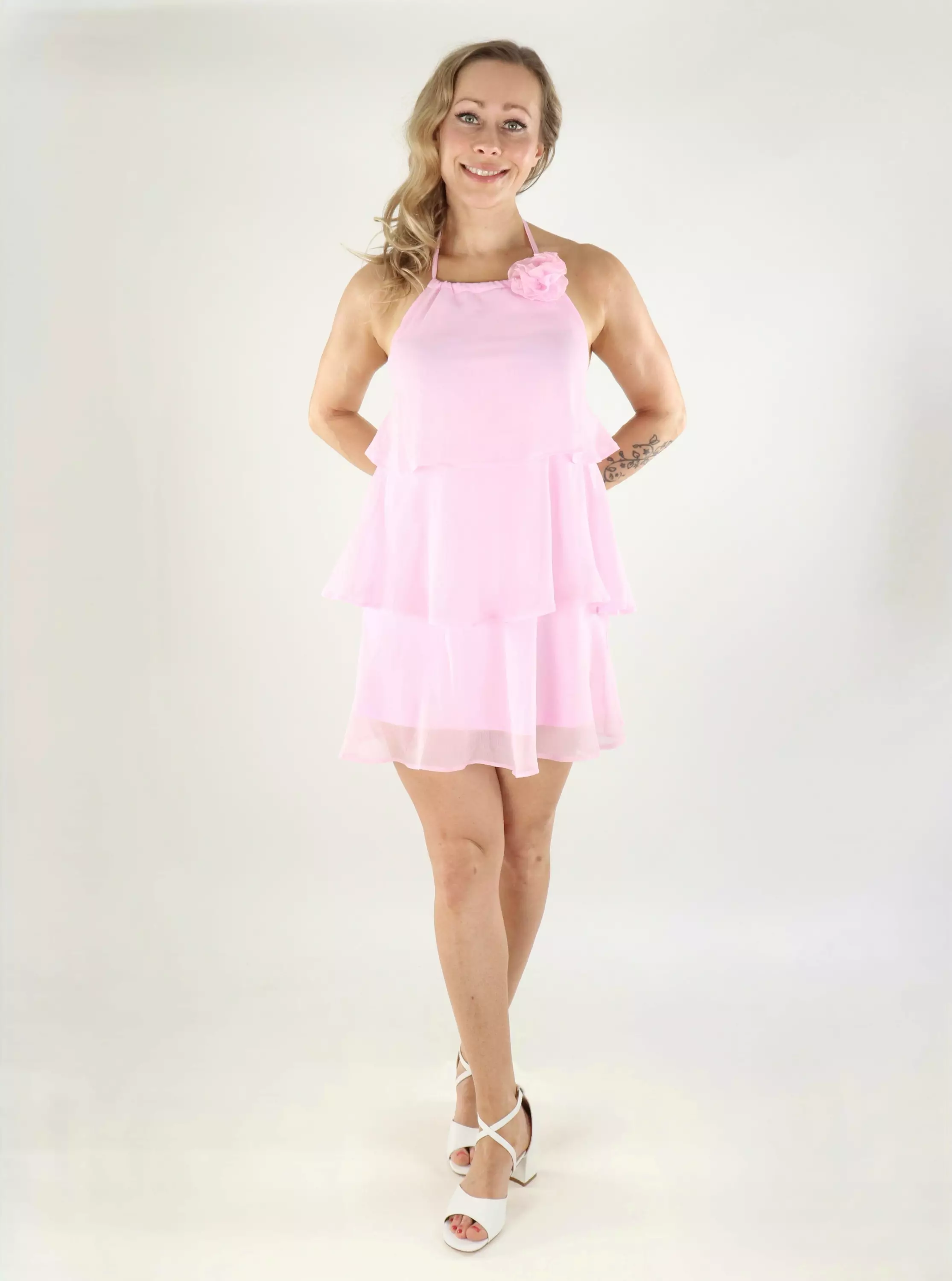 En rosa kort klänning från Pieces med en lager-på-lager volangnedkant som skapar en lätt och slående look. Blomdetaljen vid halsringningen fulländar klänningen elegant!