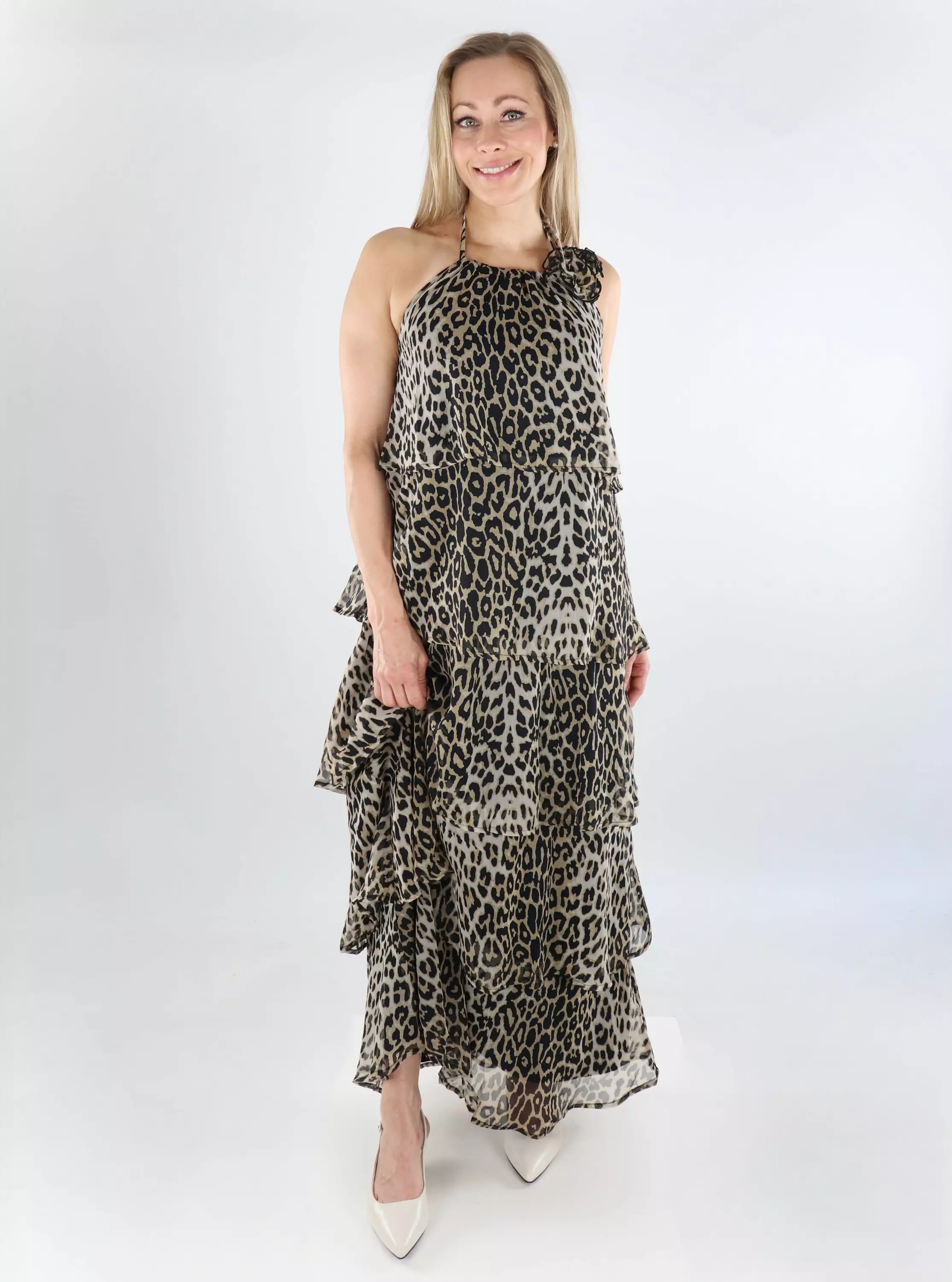 Pieces lång klänning i leopardmönstrad med lagerfåll i lager för en lätt och slående look. Den blommiga detaljen i halsen avslutar klänningen elegant!