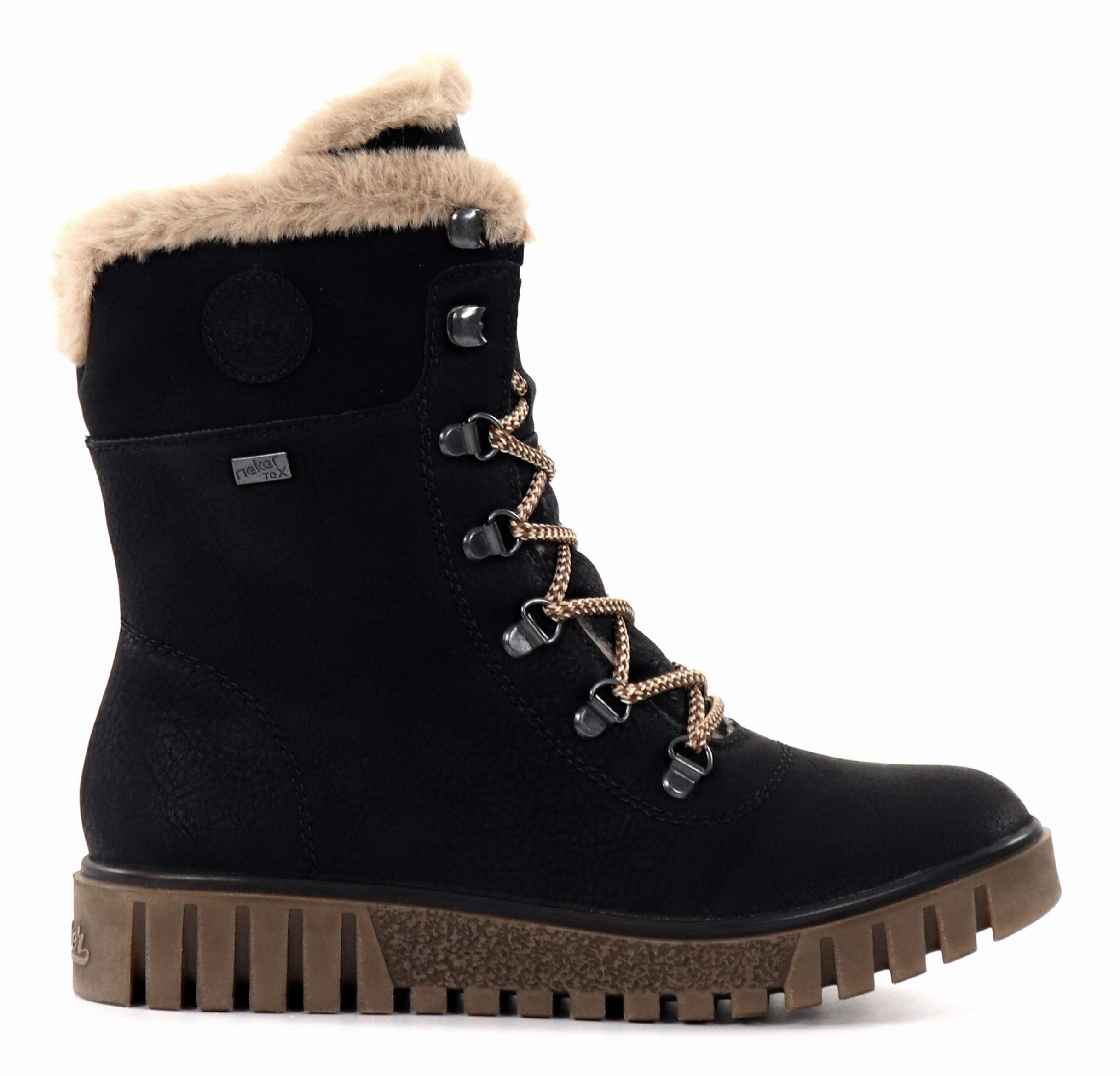 Riekers svarta ankelboots med vattenavvisande RiekerTex-membran och ett mjukt konstgjordt pälsfoder.