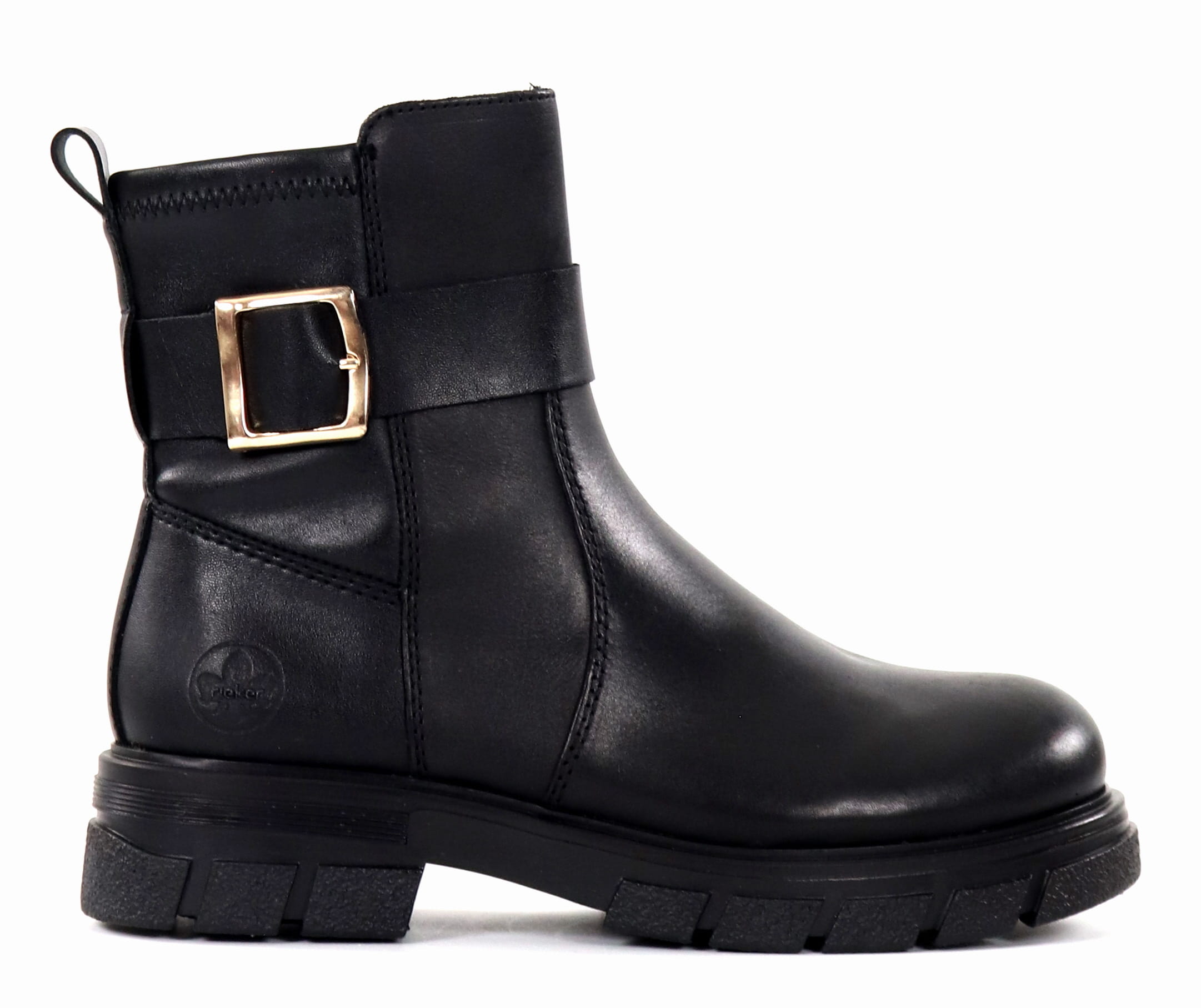 Rieker stövletter i äkta läder med ett gyllene dekorativt spänne och en varm filtsula.