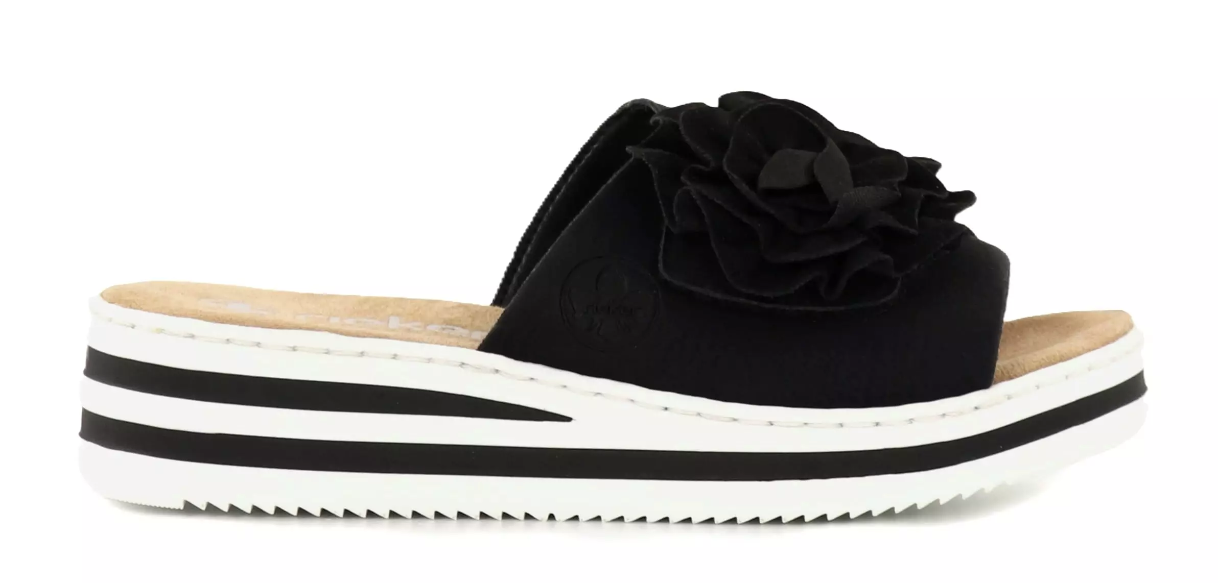 Riekers ursnygga mulor med blommiga detaljer! Med den justerbara kardborreöverdelen kan du justera skorna så att de passar dina fötter.