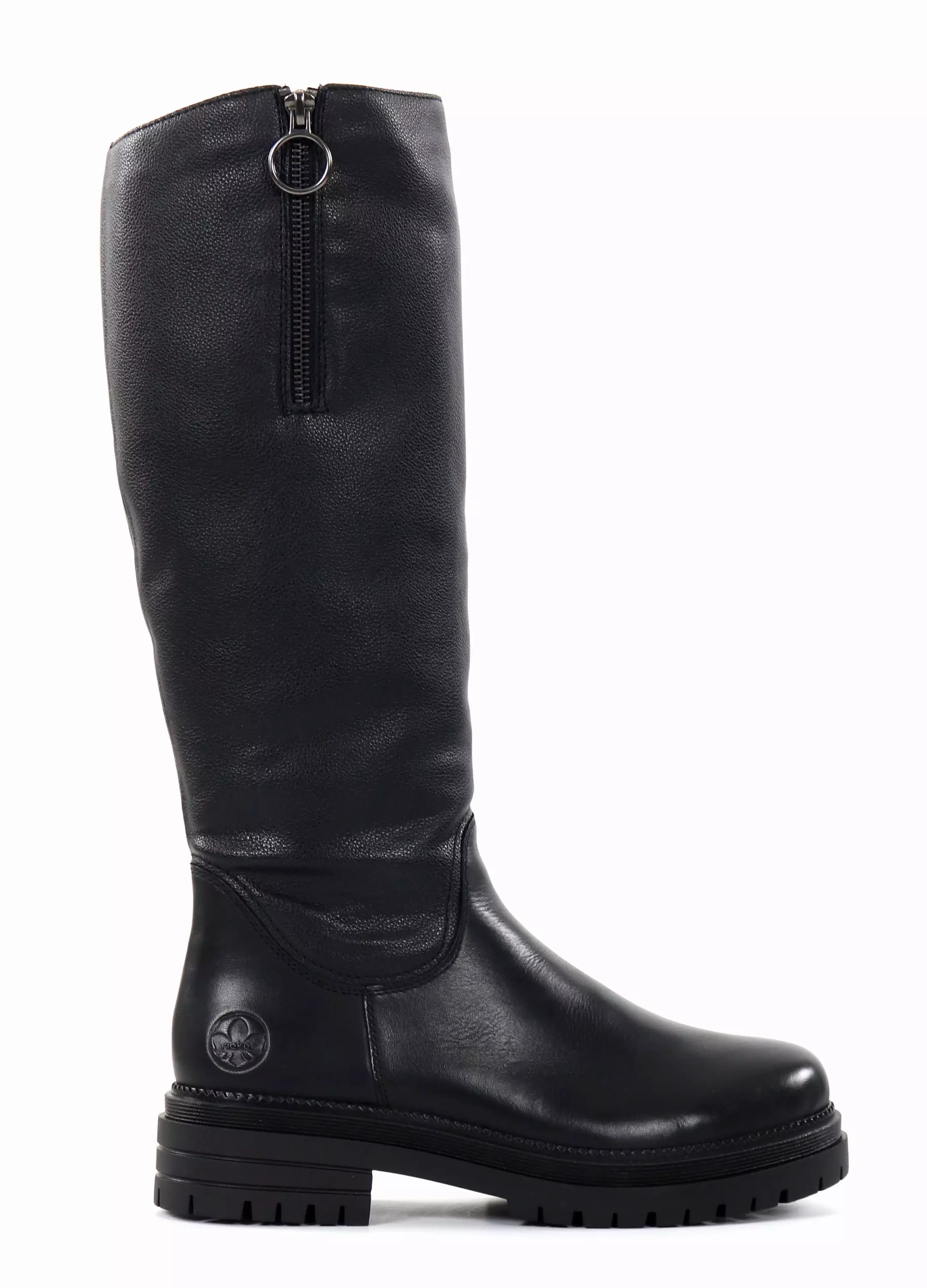 Rieker stövlar av äkta läder, med extra utrymme för skaftet med hjälp av en dragkedja på utsidan. Gripande och smidig gummisula.