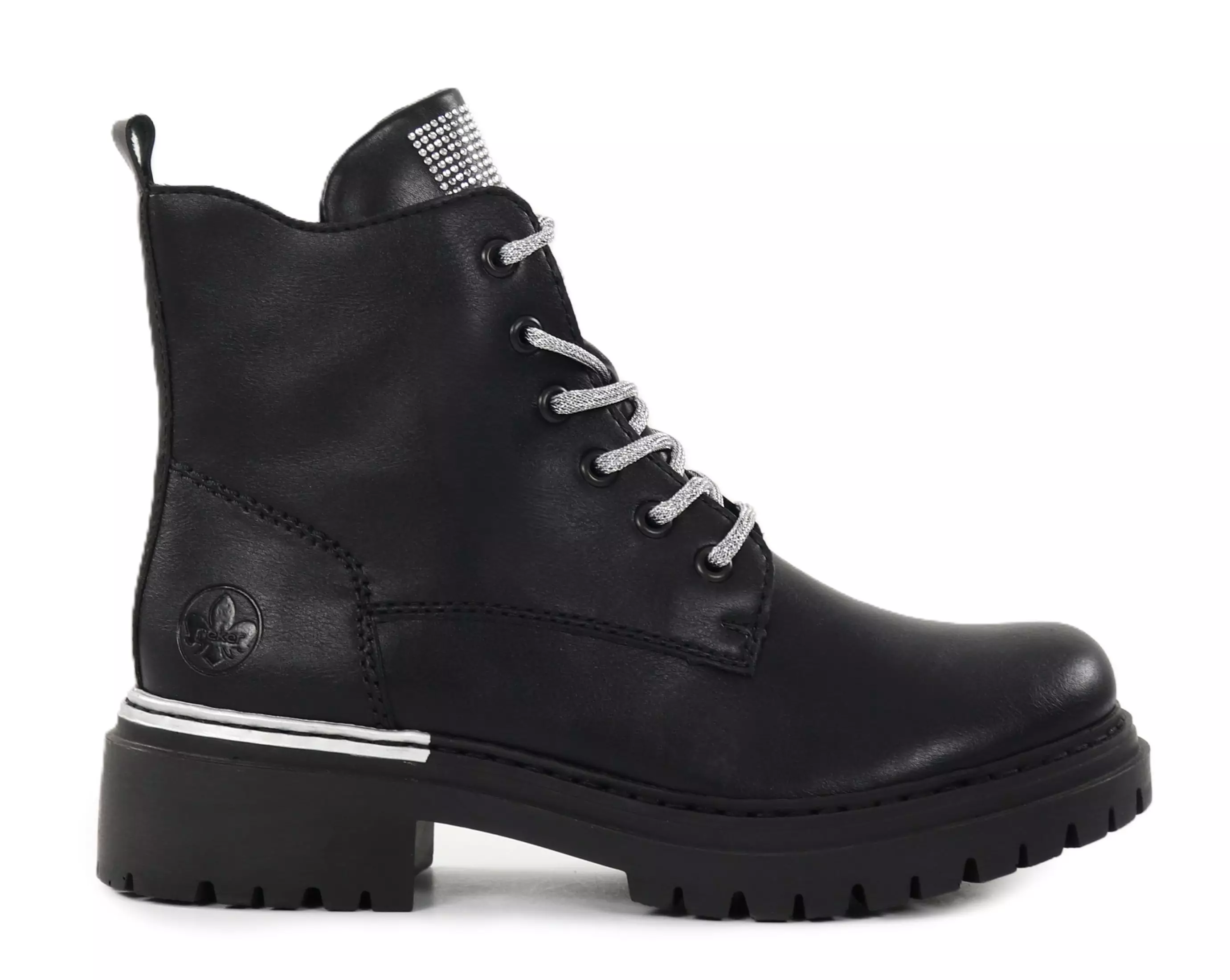 Dessa slående Rieker-stövletter kombinerar en robust kilklackmodell med feminin glitter. Silverfärgade snören och strassdekorationer ger precis rätt mängd glitter. Det varma och lätta fodret i fuskpäls säkerställer en bekväm känsla även i kallare väder.