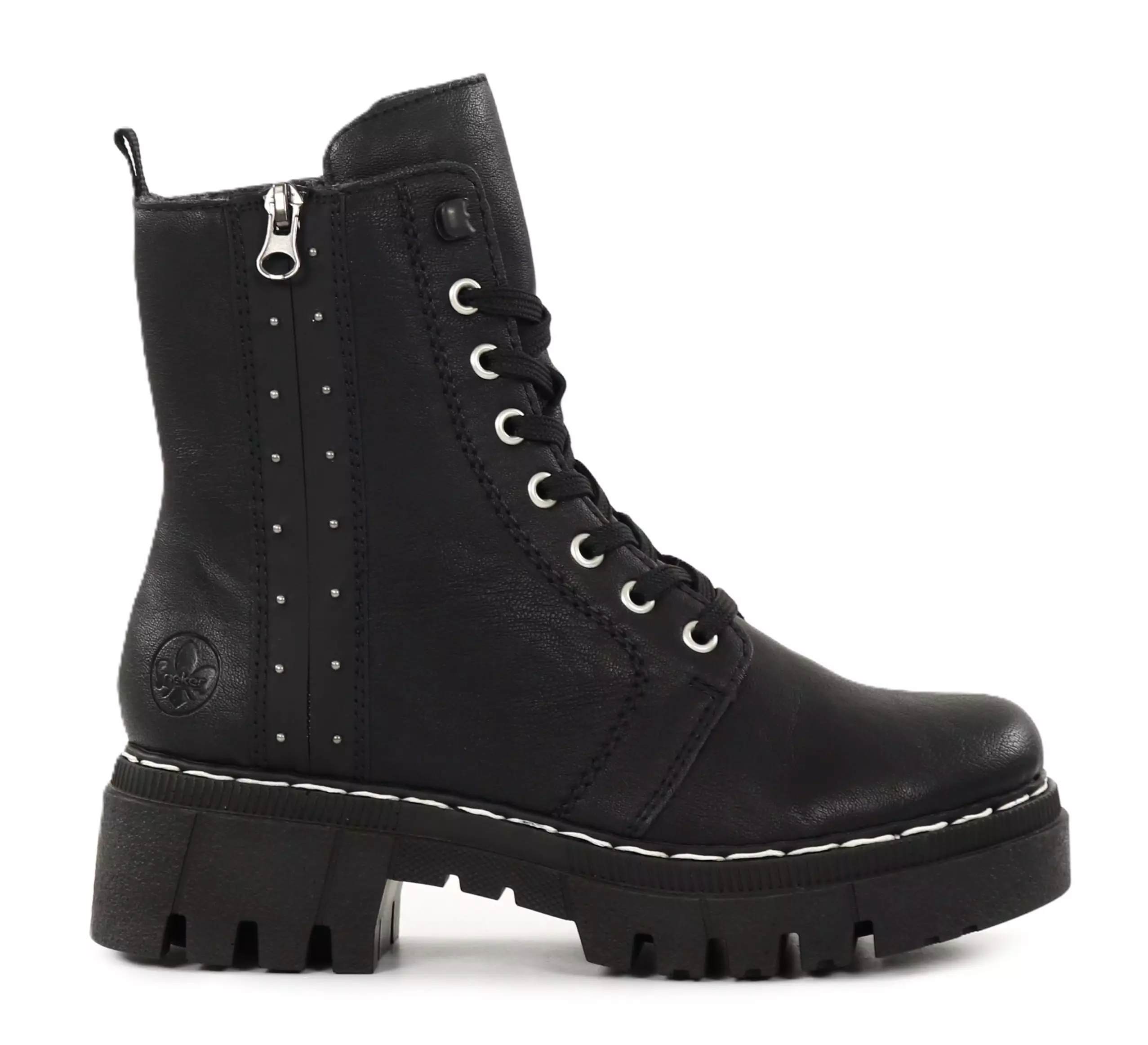 Dessa Rieker stövletter med kilklack kombinerar ett robust utseende med praktiska detaljer. Det varma filtfodret och den mjuka filtinnersulan håller dina fötter behagligt varma även på kalla dagar. Looken kompletteras av en dragkedja på utsidan, vilket ger både stil och gör dem lättare att ta på.