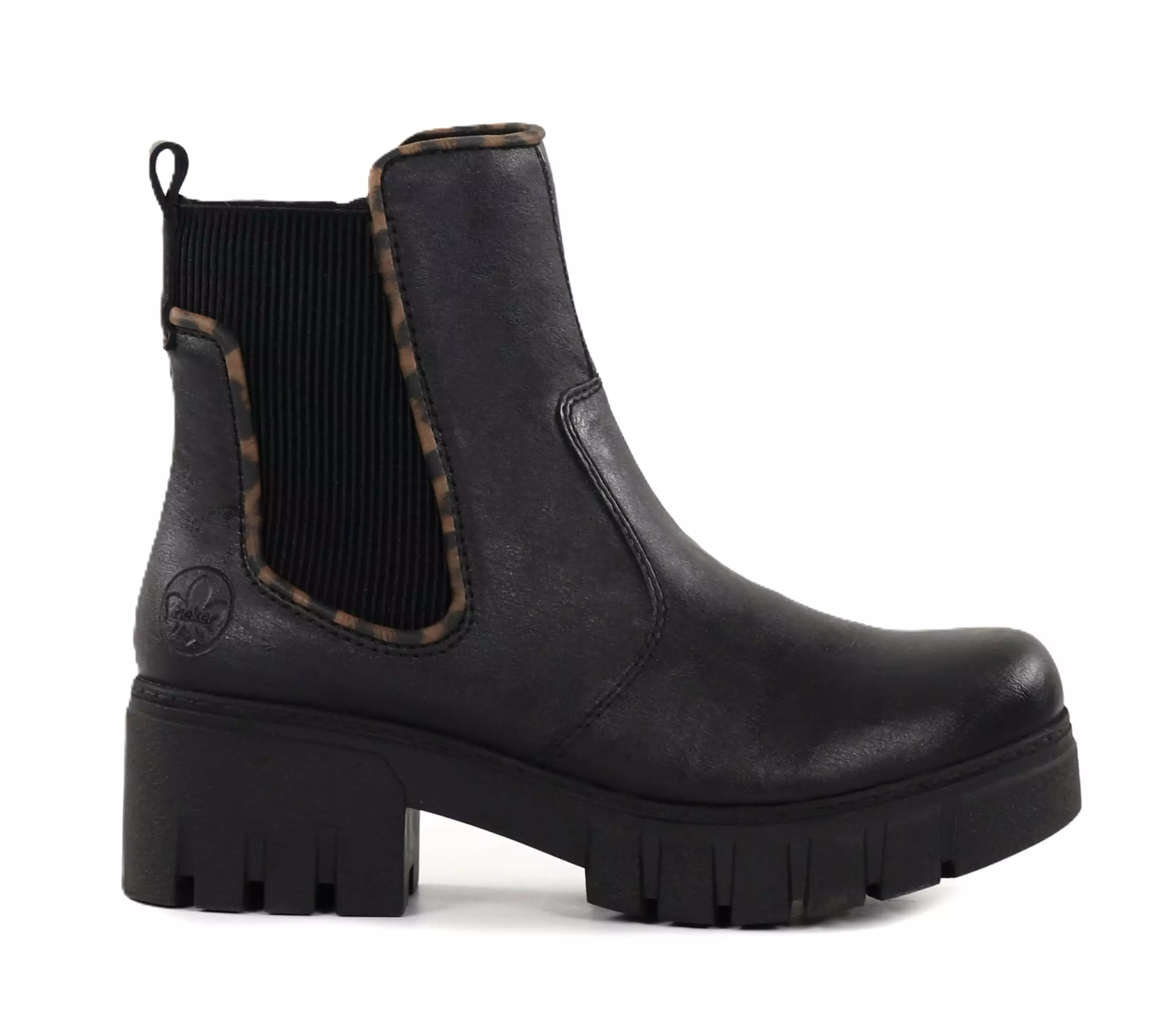 Rieker stövletter med tjock sula, uttagbara inlägg och snygga leoparddetaljer. Det perfekta valet för både vardag och fritid!