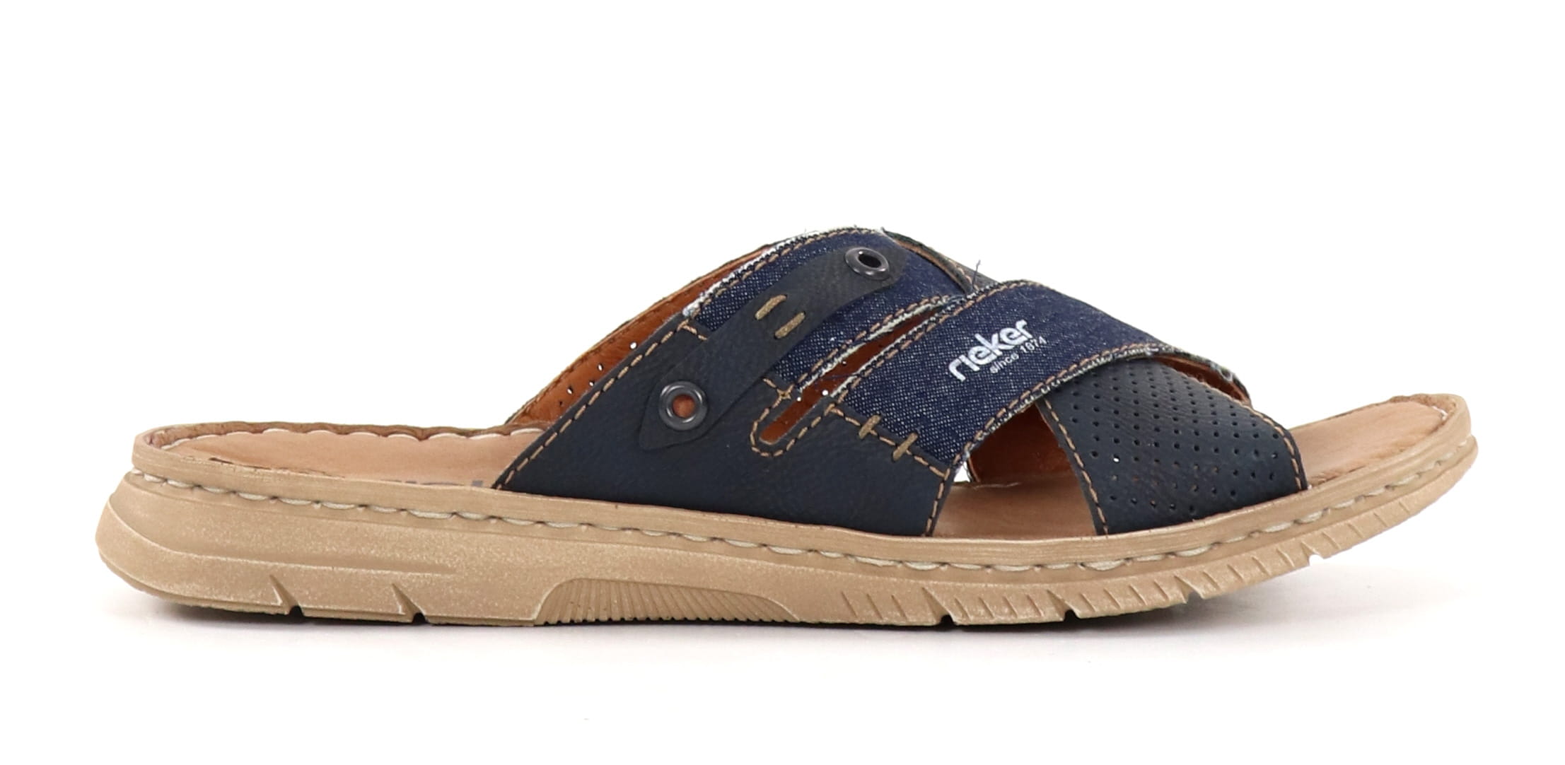- Denim och spännedetaljer och en Rieker-logga på toppen