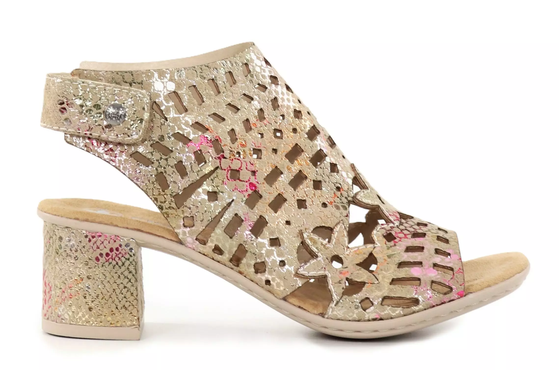 Färgglada, högklackade sandaler med mjuka innersula och bekväma platåklackar. Den perforerade, skimrande färgglada ovandelen ger sandalerna en stil!