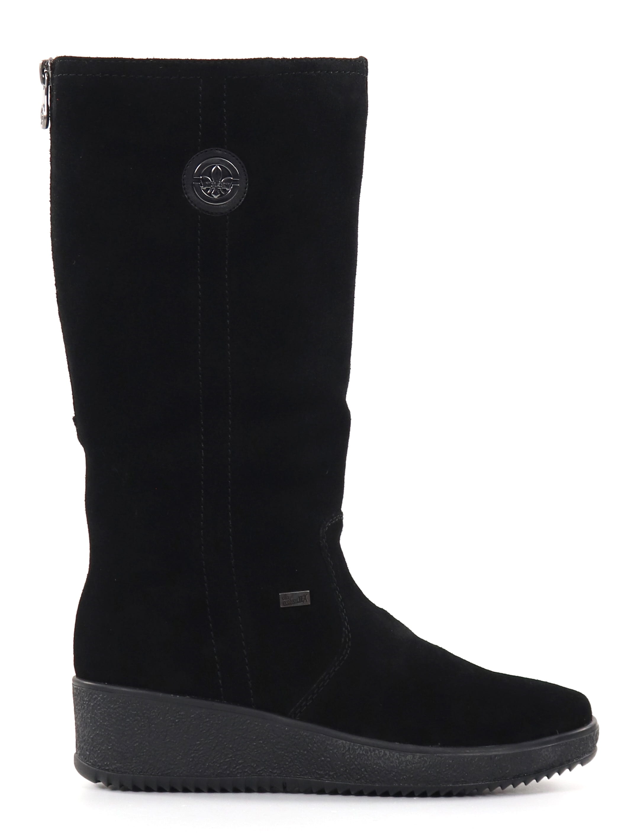 Rieker-stövlar i mockaskinn med en bekväm kilklack och ett varmt lammullsfoder. Med dragkedjorna på baksidan kan du enkelt justera skaftets bredd.