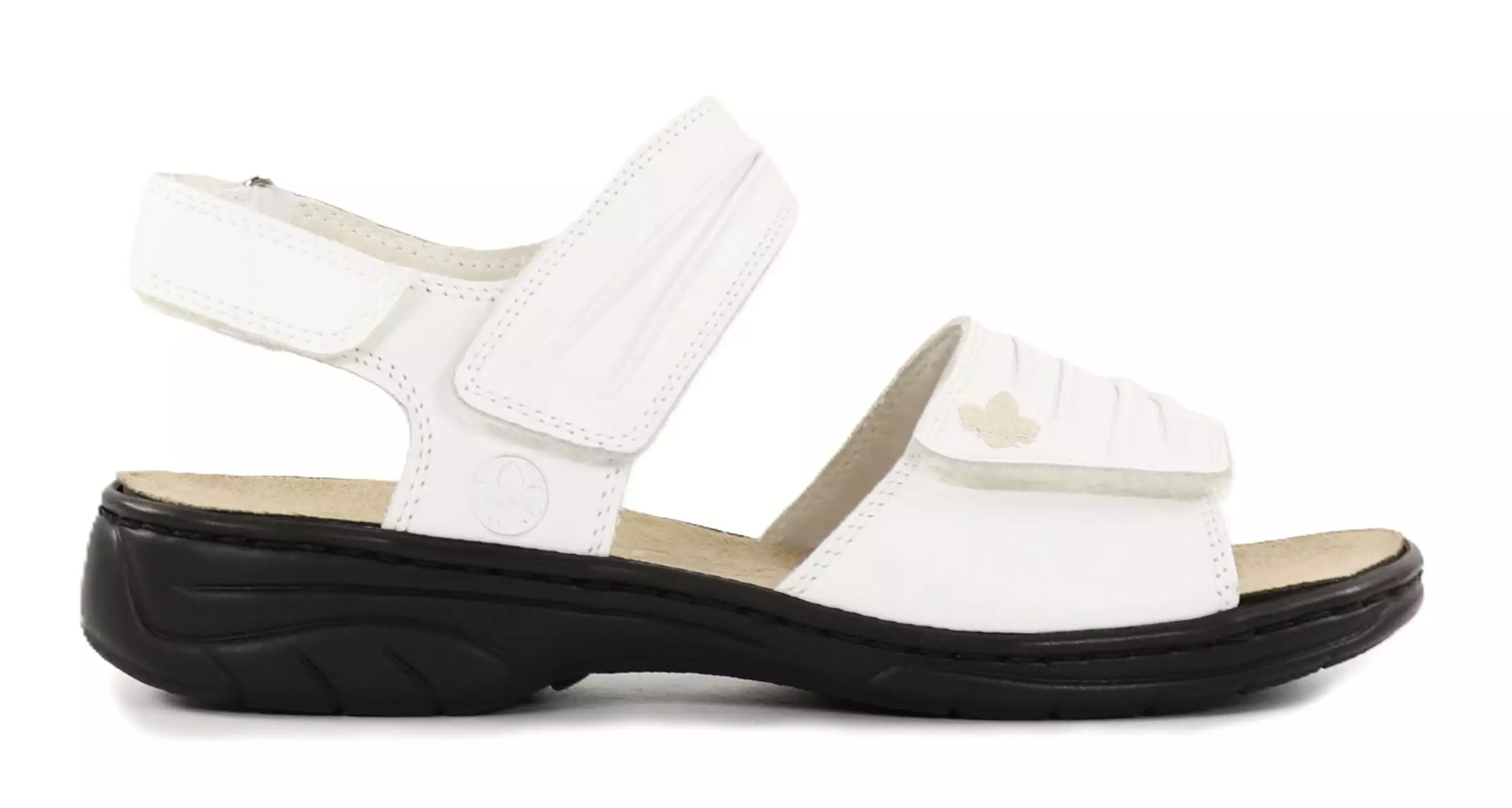 Fräscha vita Riekersandaler med mjuka och flexibla sulor som ger utmärkt komfort för dina fötter! Tre justerbara remmar med kardborre gör att du kan justera passformen på skorna så att den passar dina fötter.