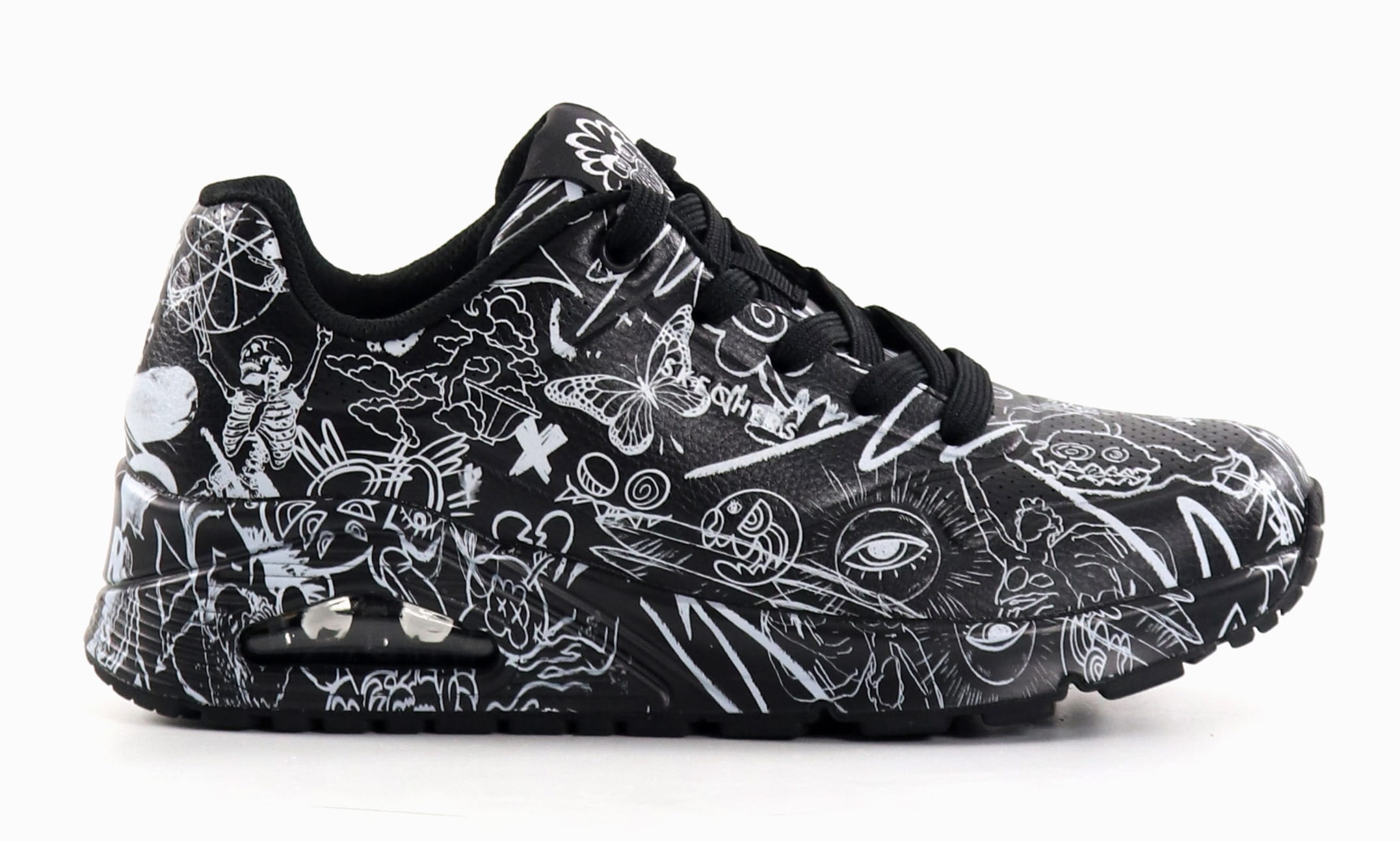 Dyk in i en värld där konst och stil möts i Skechers x Vexx-kollektionen! Modesneakern Uno - Process Sketch framhäver Vexxs konst med en durabuck-överdel, synligt Skech-Air-mellanlager och Skechers Air-cooled Memory Foam-innersula för optimal komfort.