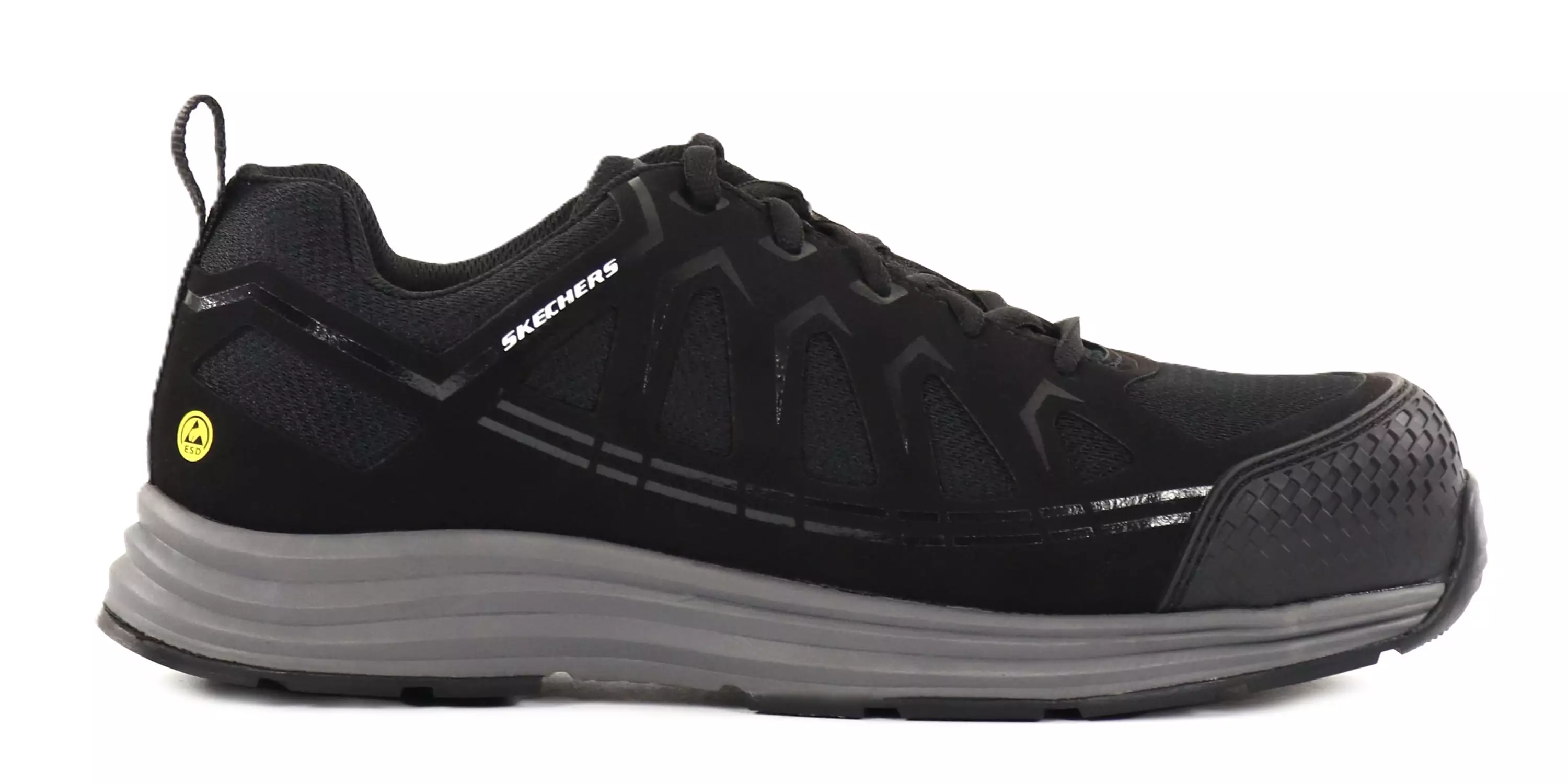 Skechers lätta och sportiga skyddssko med en andningsbar ovandel och tåhätta i kompositmaterial. ESD-konstruktionen förhindrar ansamling av statisk elektricitet och metallfritt spiktrampskydd ökar säkerheten. Den stötdämpande Hi-Poly-innersulan ger komfort vid gång.