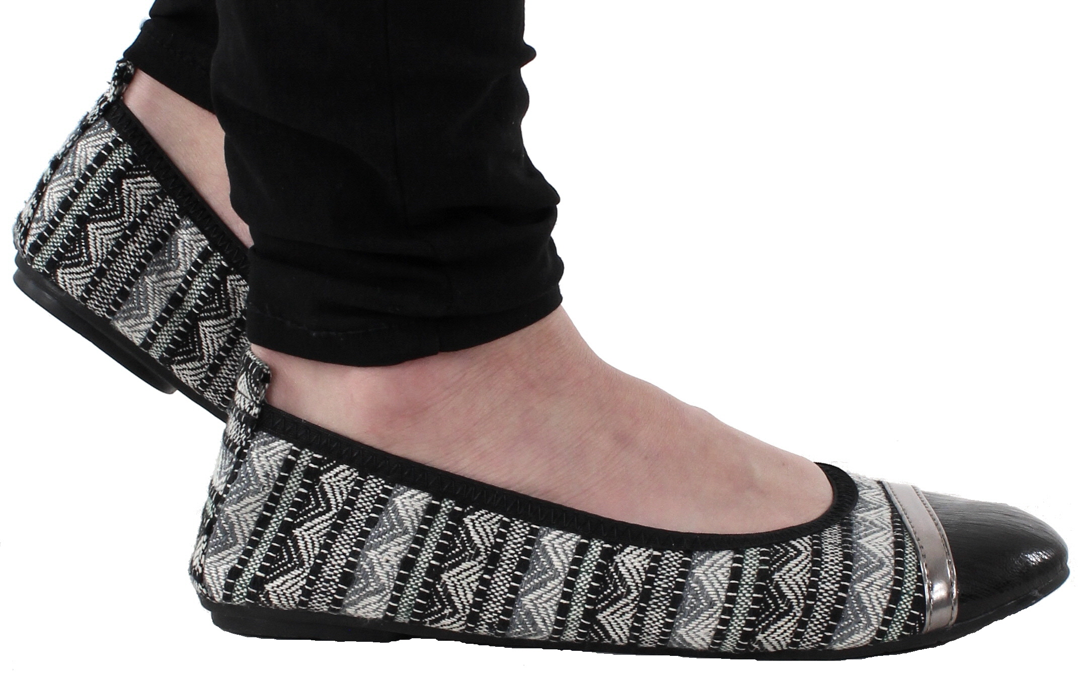 Praktiska ballerinaskor i textil kan sättas i ett litet påse om behövs