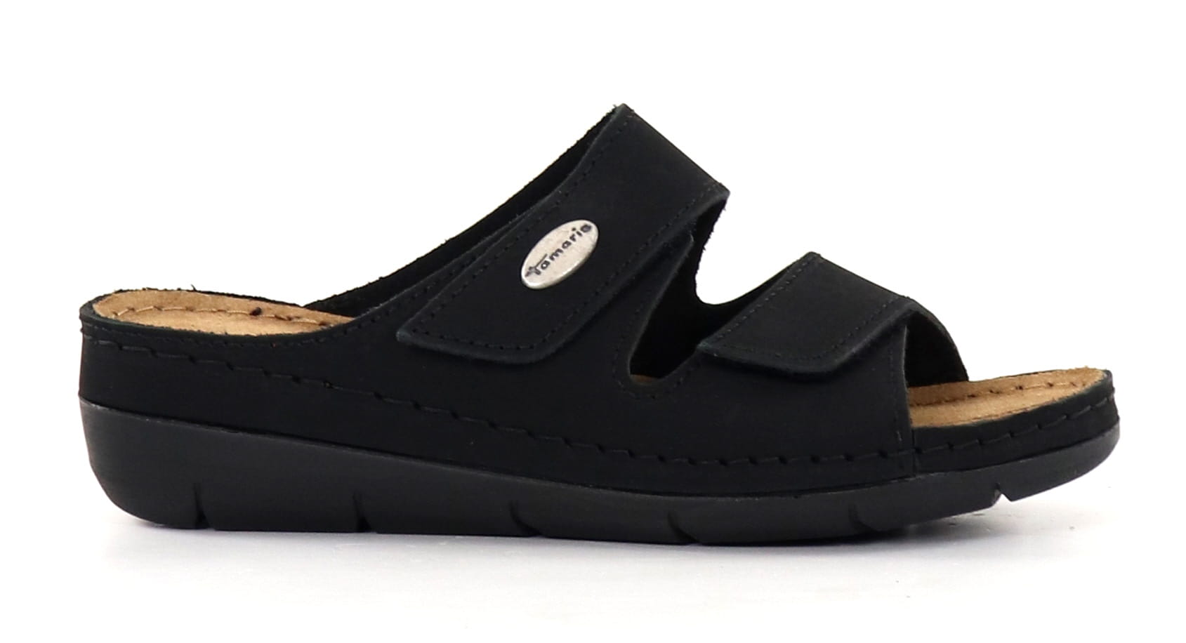 Tamaris dam slip-in sandaler 27510-41 svart Läder slip-in sandaler med anatomisk innersula. - Övre och inre del i äkta läder - Passar som vardags- och arbetsskor - Justerbar kardborreknäppning - Anatomiskt formad lädersula - Smidig gummiblandningssula Mått i storlek 37: - Innersula ca. 24 cm - Klack ca. 5 cm - Cirka. 2,5 cm vid bollen av foten