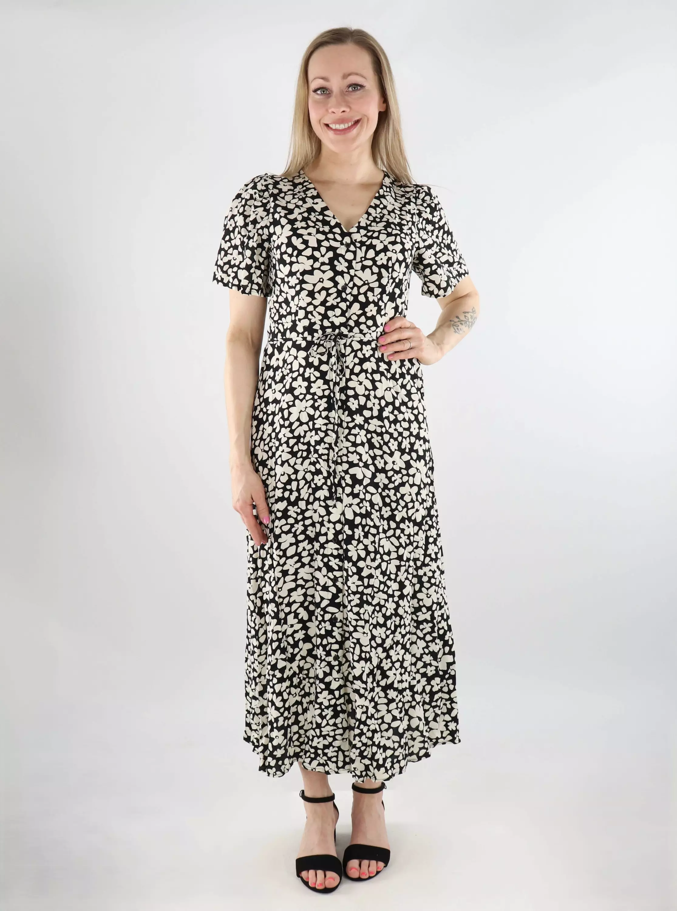 En ljus blommig klänning med knappar och V-ringning. Tillverkad av mycket lätt viskos som andas.