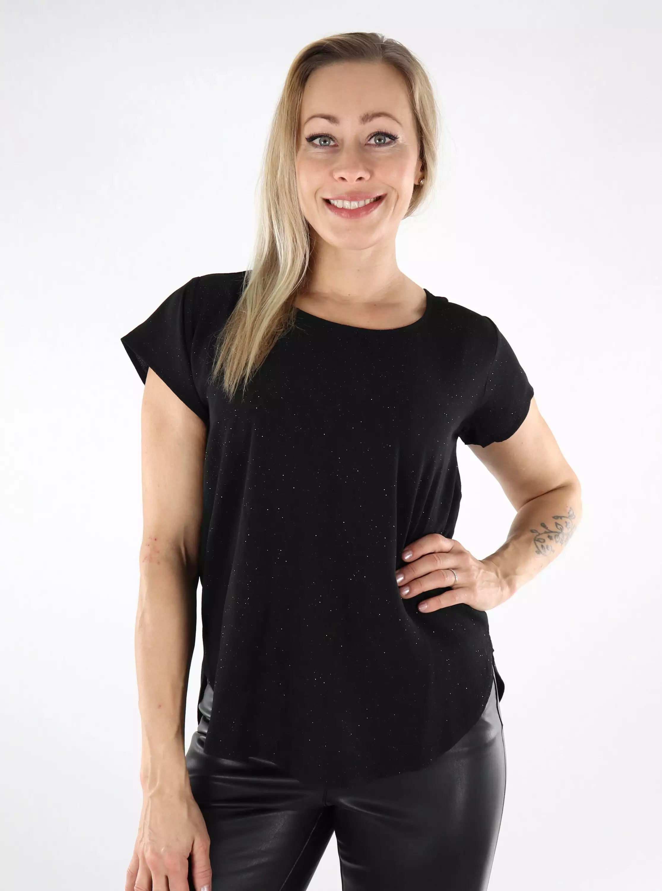Glitterdekorerad t-shirt med rundad fåll. Guldfärgad dragkedja på baksidan!