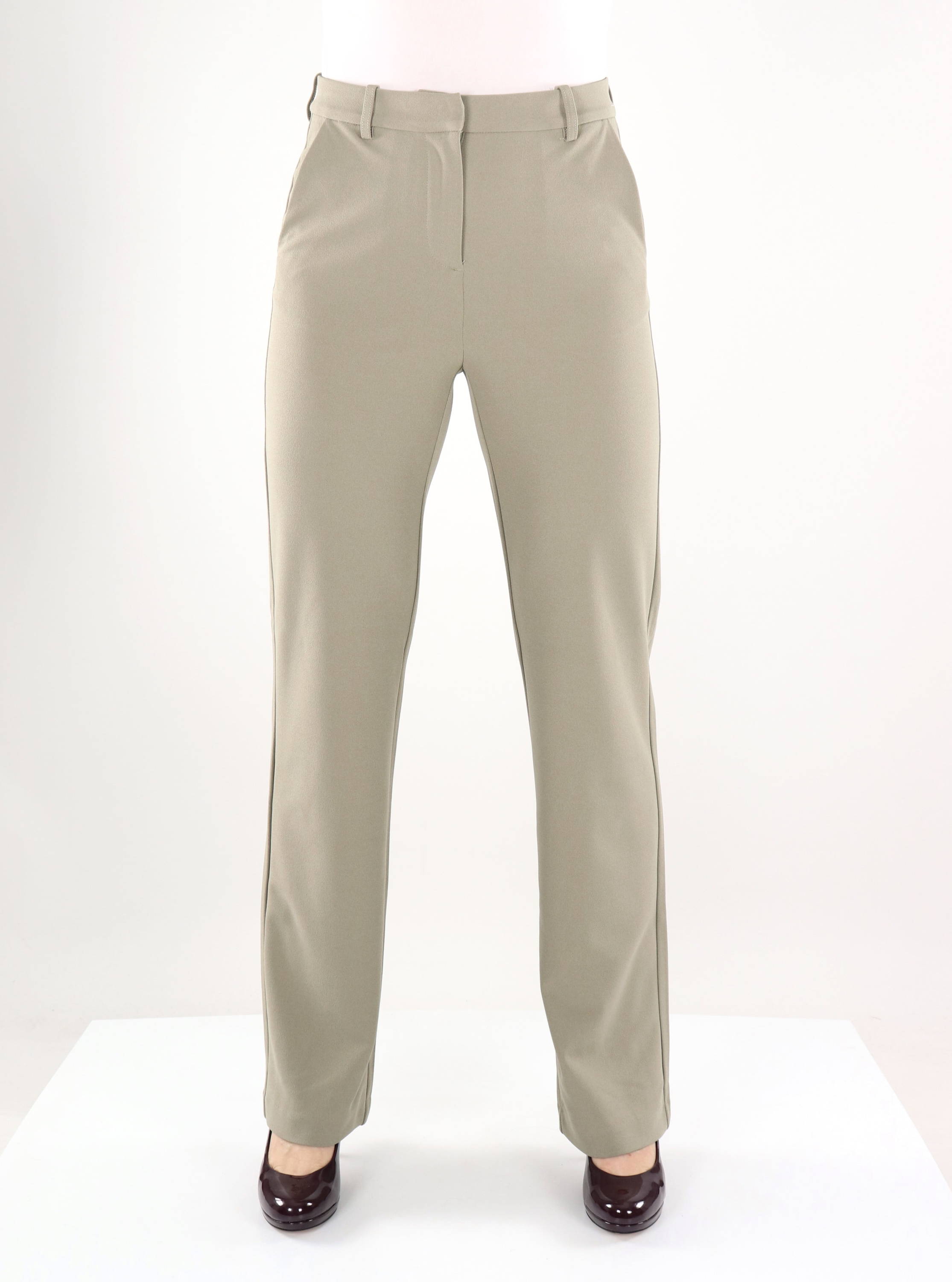 Raka byxor med bälteshällor, dragkedja och knäppning fram, sidfickor och strukturtyg.