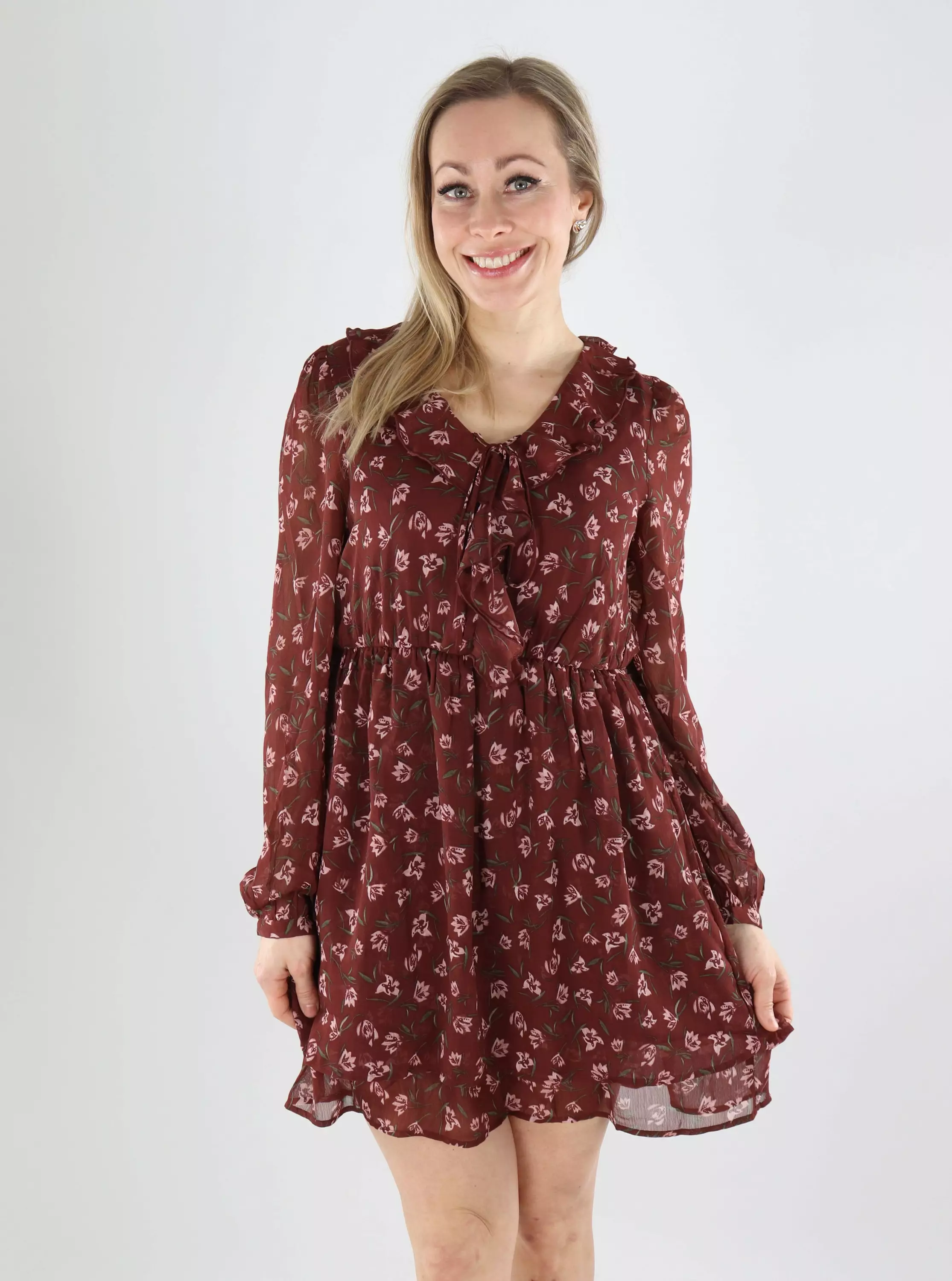 En lätt och feminin klänning från Vero Moda. Klänningen har en smickrande V-ringning och vackra volangdetaljer, samt ett resårband bak i midjan för extra komfort.