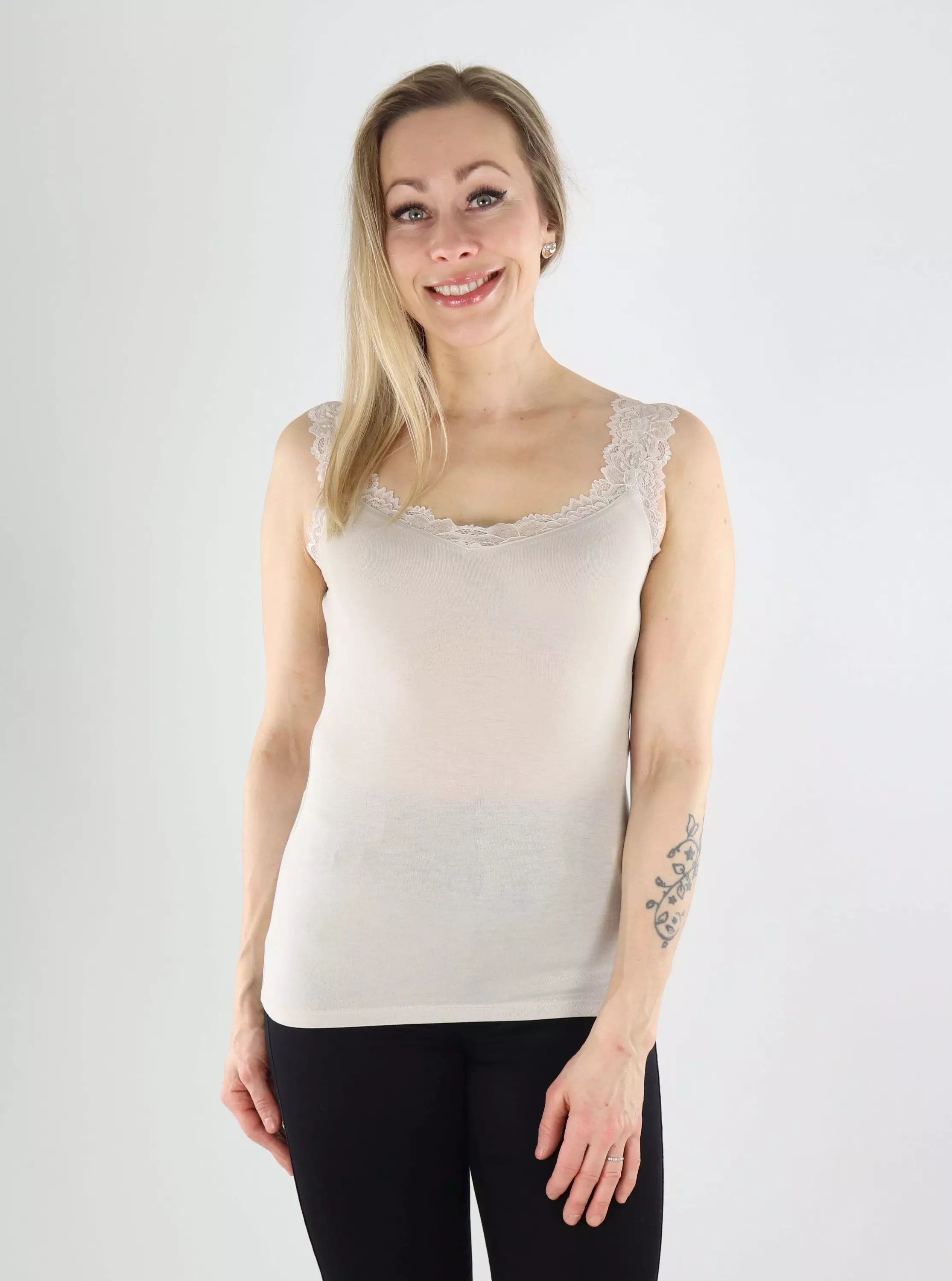 Denna Vero Moda-topp är tillverkad av en mjuk viskosblandning som känns bekväm mot huden. Halsringningen är dekorerad med vacker spets, vilket ger toppen ett feminint utseende. Passar både till vardags och fest!