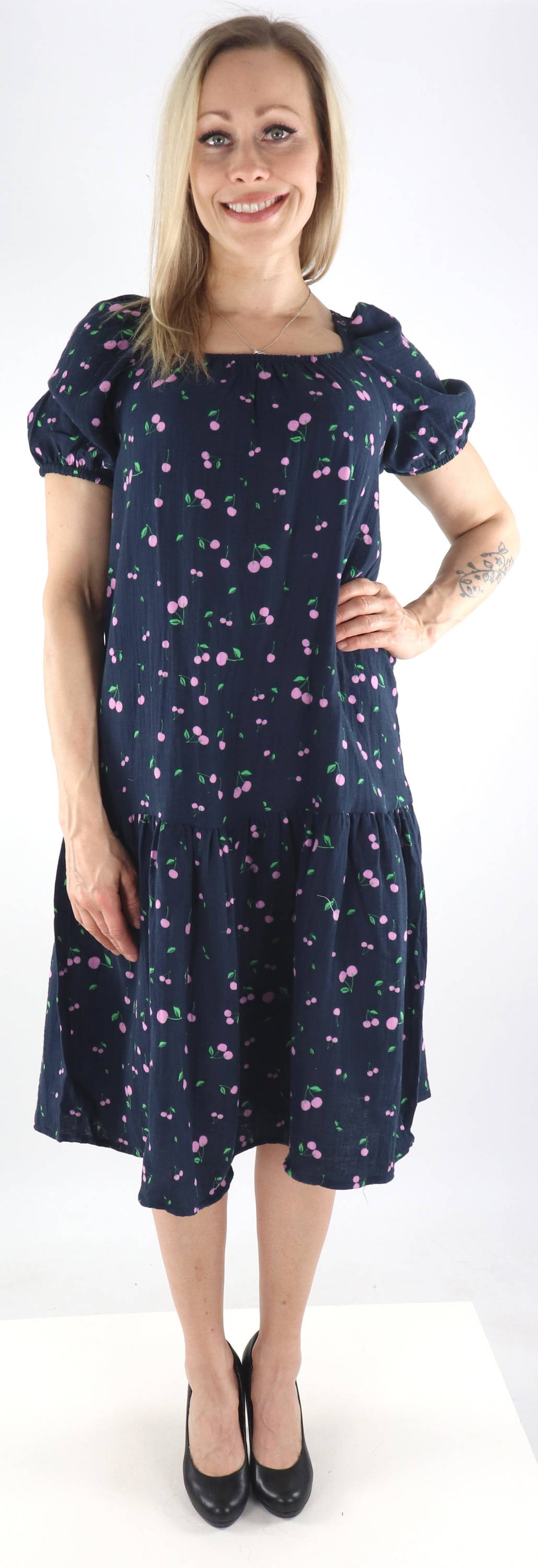 Klänning i bomull med körsbärsmönster och dragsko bak.