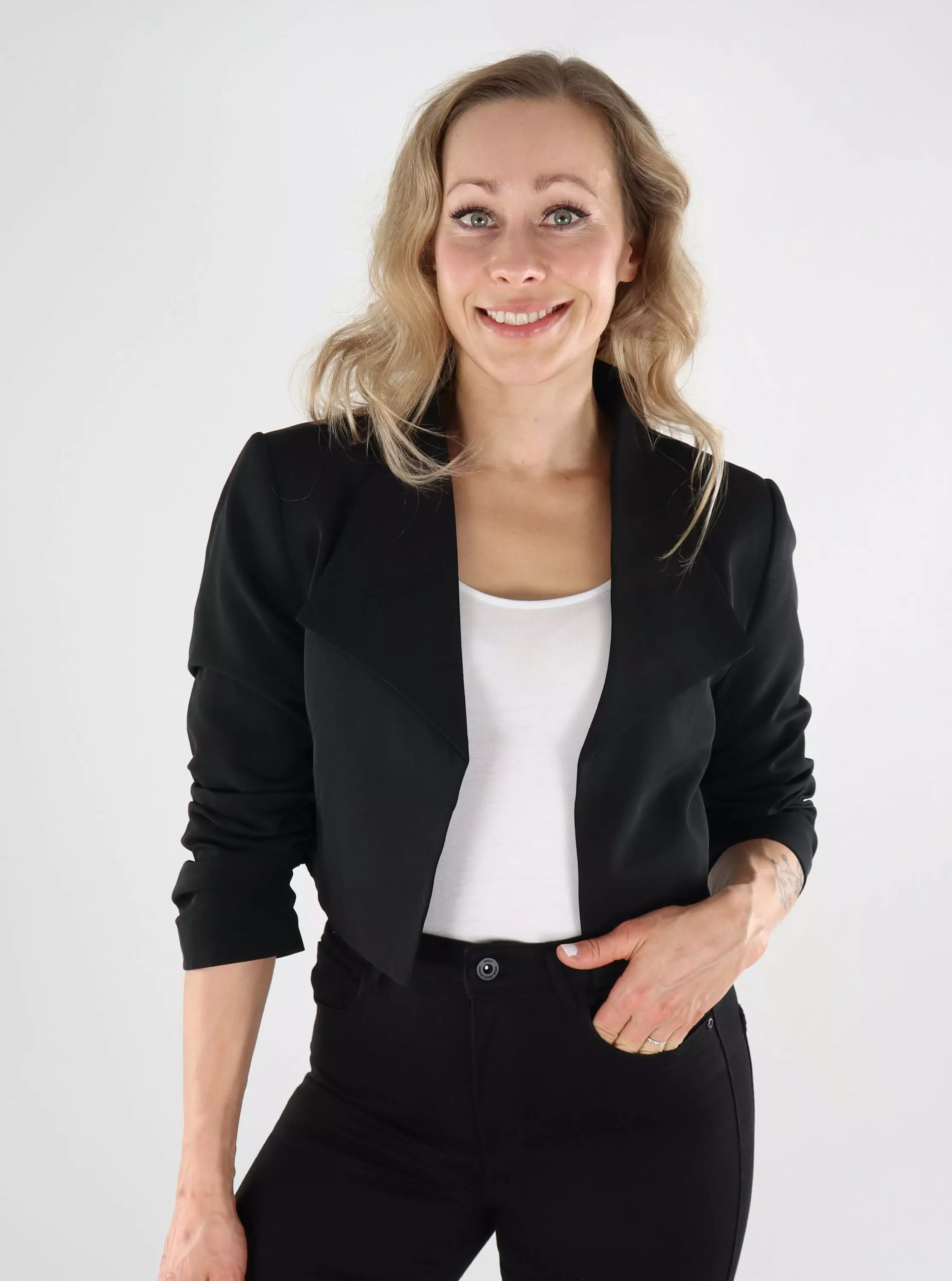 Vilas trendiga korta kavaj, som också är ett perfekt val att kombinera med klänningar! Lätta axelvaddar ger kavajen en lämplig mängd elegans.