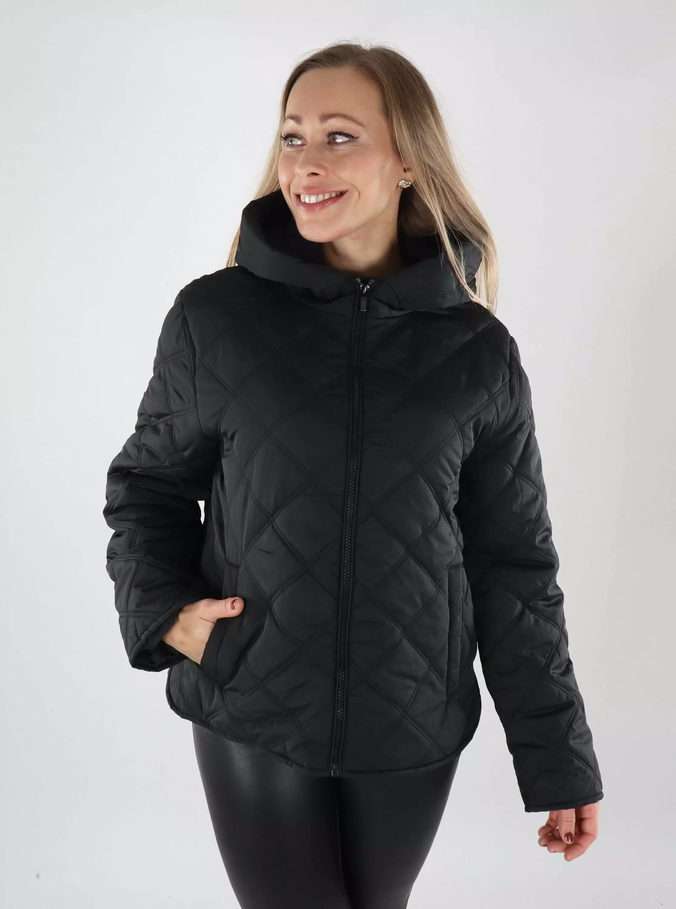 Vilas vackra quiltade lätta vadderade jacka med fast huva och rundad fåll.
