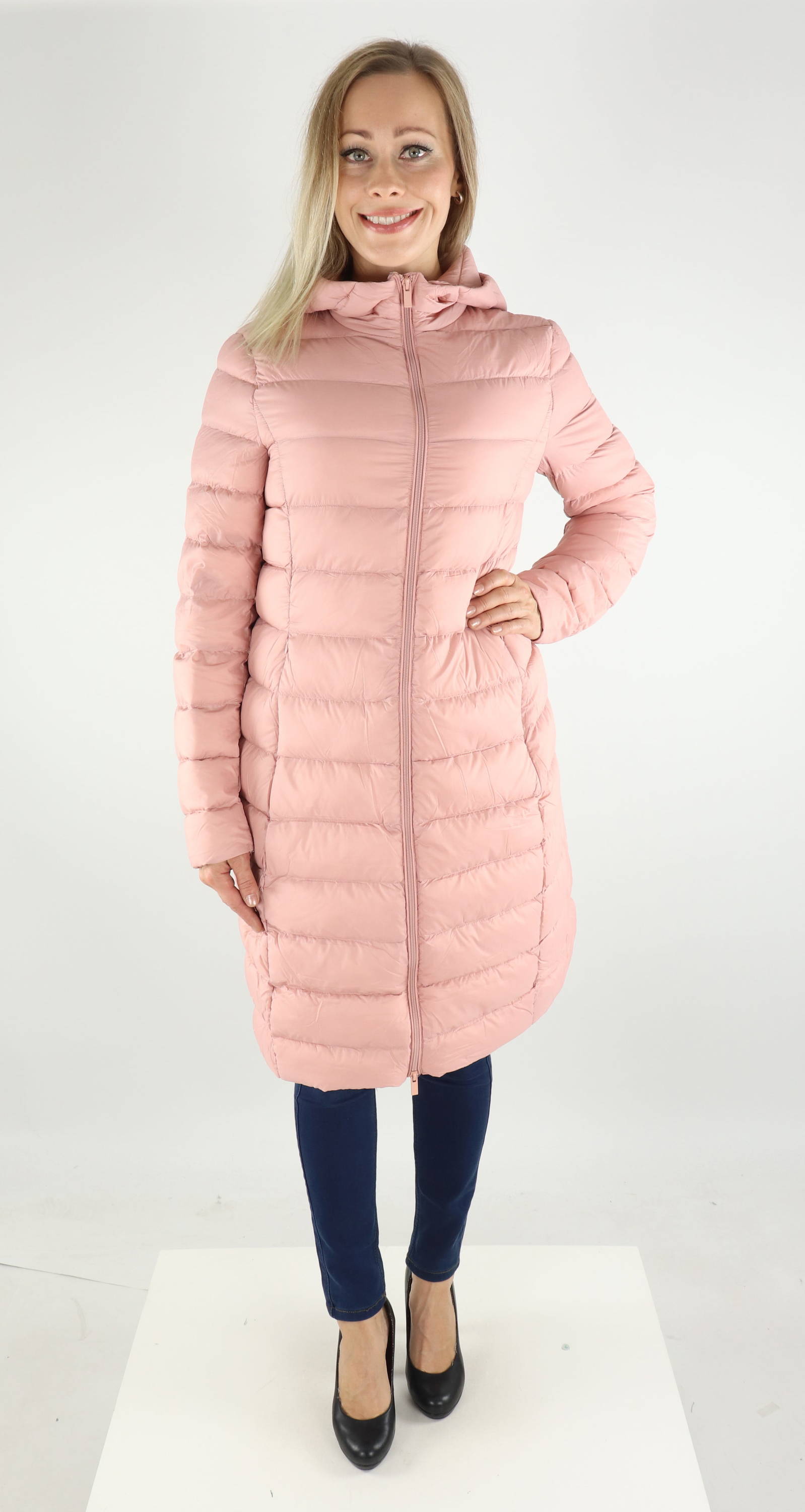 Lång, verkligen lätt dunjacka med huva, dragkedja och fickor med dragkedja.