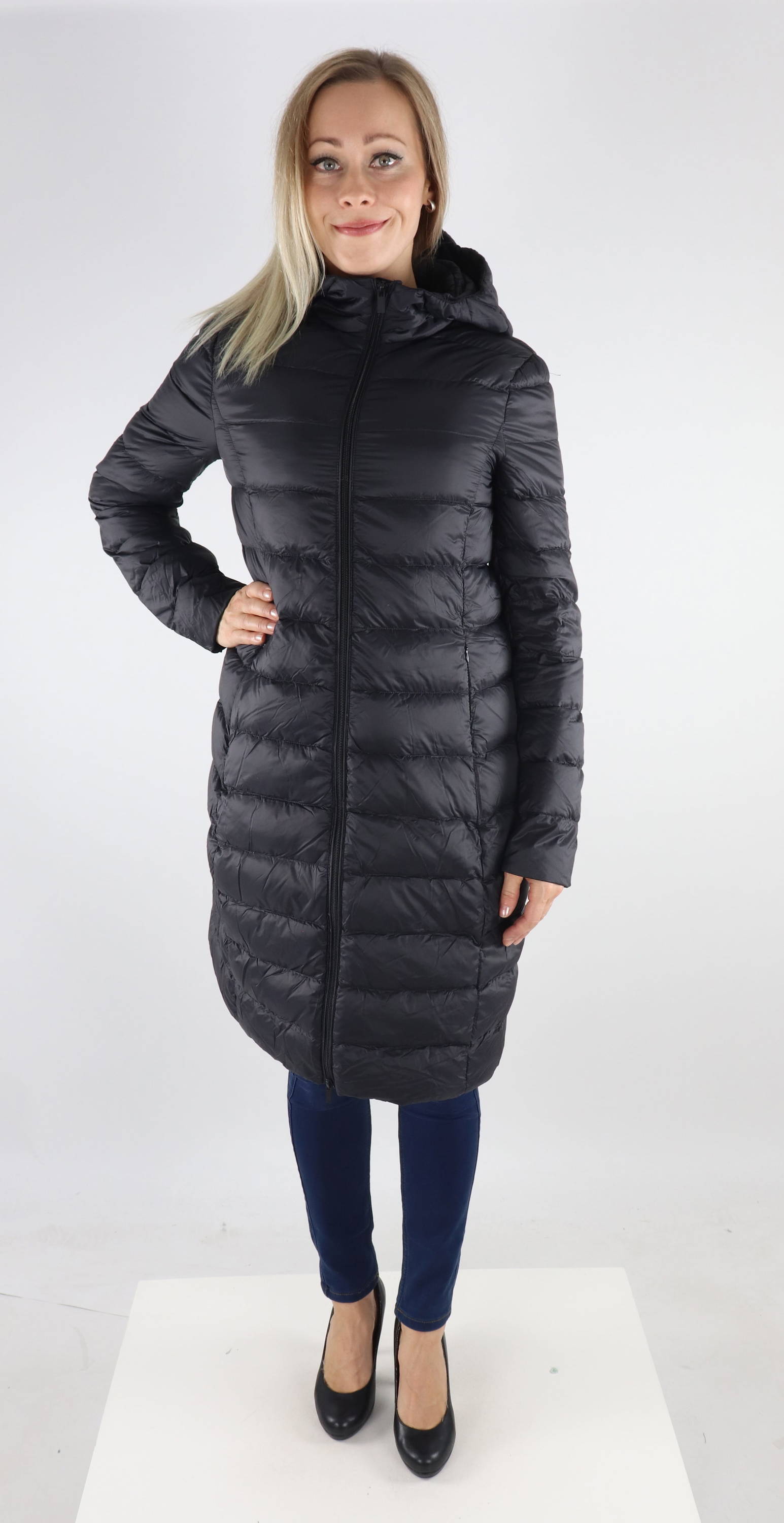 Lång, verkligen lätt dunjacka med huva, dragkedja och fickor med dragkedja.