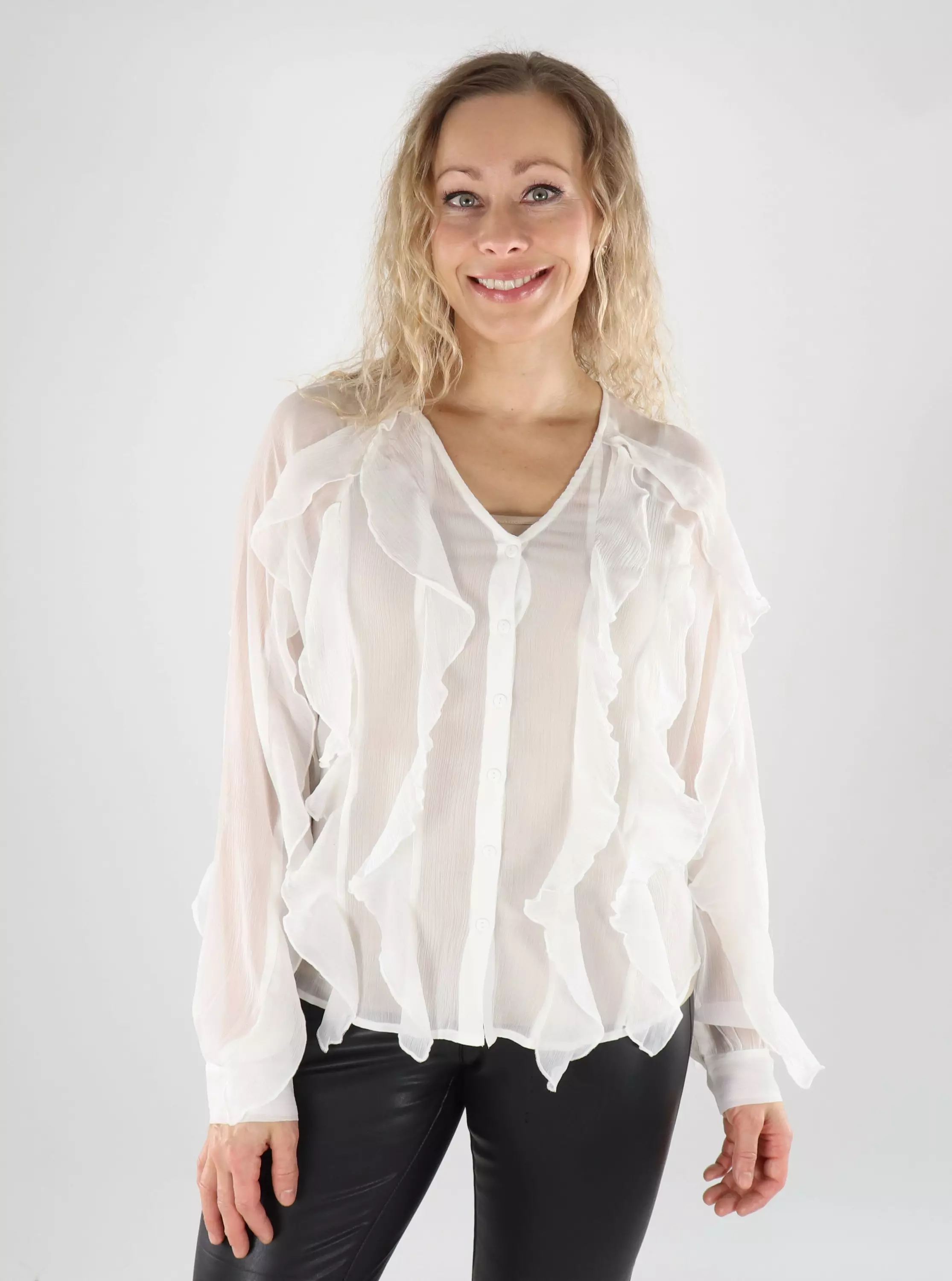 Vila-blus med snygga volangdetaljer och en feminin V-ringning. Den lätta och luftiga modellen är perfekt för både avslappnade och mer eleganta outfits. Ett enkelt val när du vill ha en välvårdad look utan ansträngning.