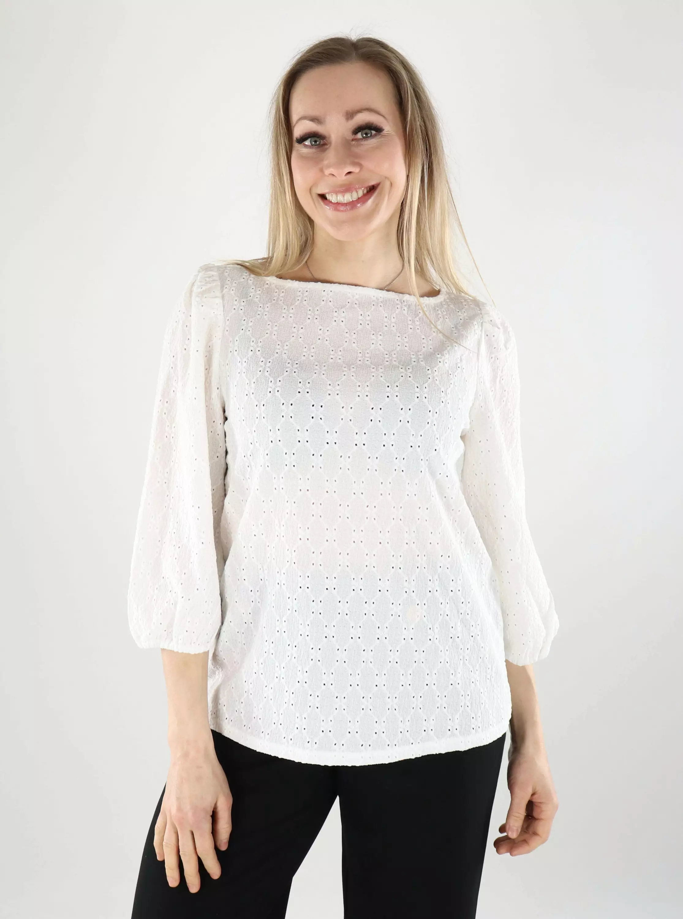En skjorta från VILA med ett vackert hålmönster som ger outfiten en lätt och prålig känsla! Det stretchiga materialet säkerställer en bekväm passform, och den snygga båtkragen kompletterar den tidlösa looken. Perfekt för både vardagsbruk och mer eleganta outfits.