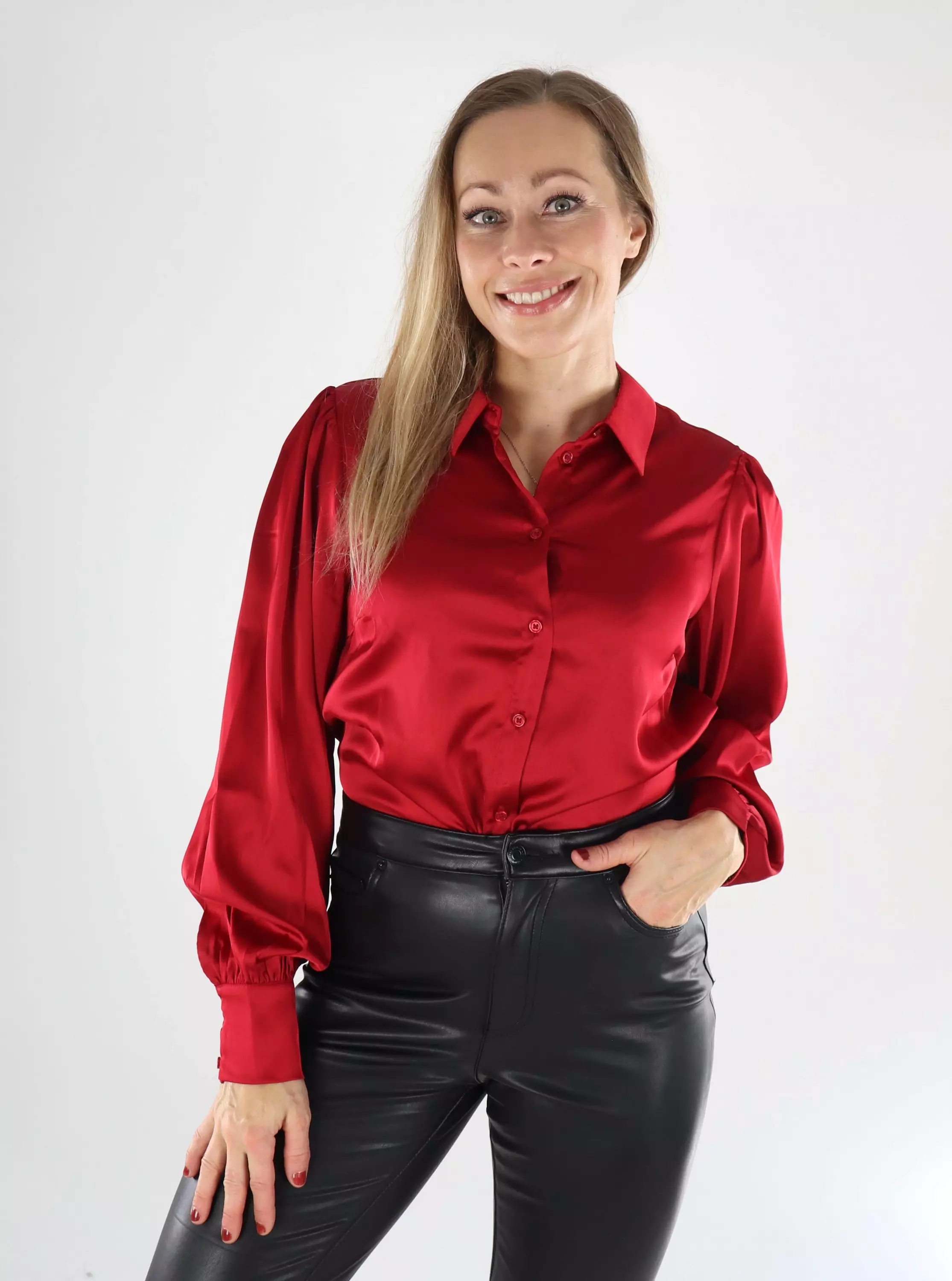 En röd satinskjorta från Vila ger din outfit en touch av lyx och elegans! Den blanka ytan och den enkla skärningen gör den enkel att kombinera med både byxor och kjolar.