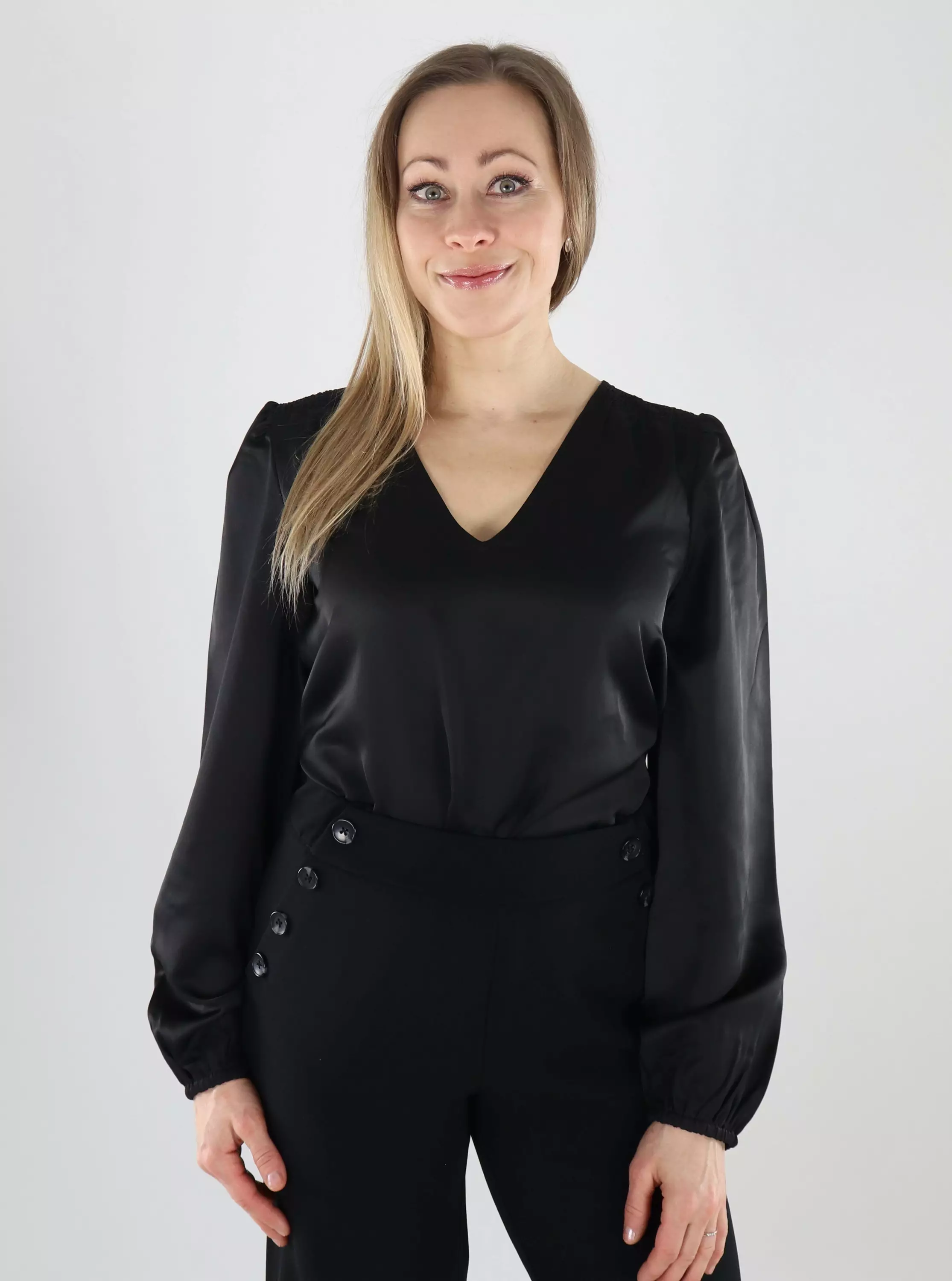 En mångsidig satinskjorta är ett säkert val när du vill ha en välvårdad men avslappnad look. V-ringningen framhäver urringningen vackert och smockdetaljerna på axlarna ger outfiten ett slående utseende.