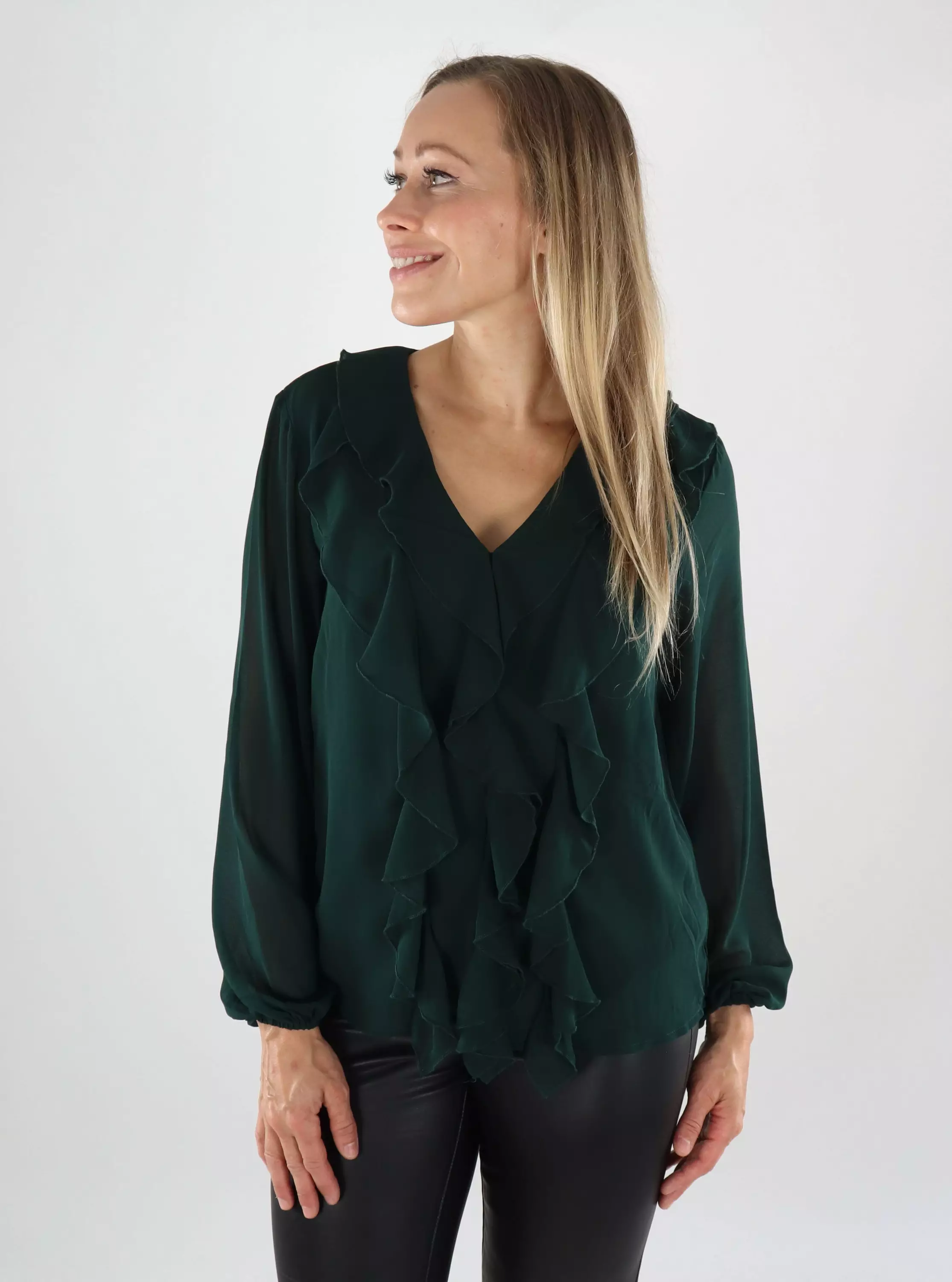 Ett vackert och elegant val för vardag eller fest! Denna mörkgröna VILA-skjorta charmar med feminina volangdetaljer och en smickrande V-ringning. Det lätta materialet och de genomtänkta detaljerna gör denna skjorta lätt att kombinera.