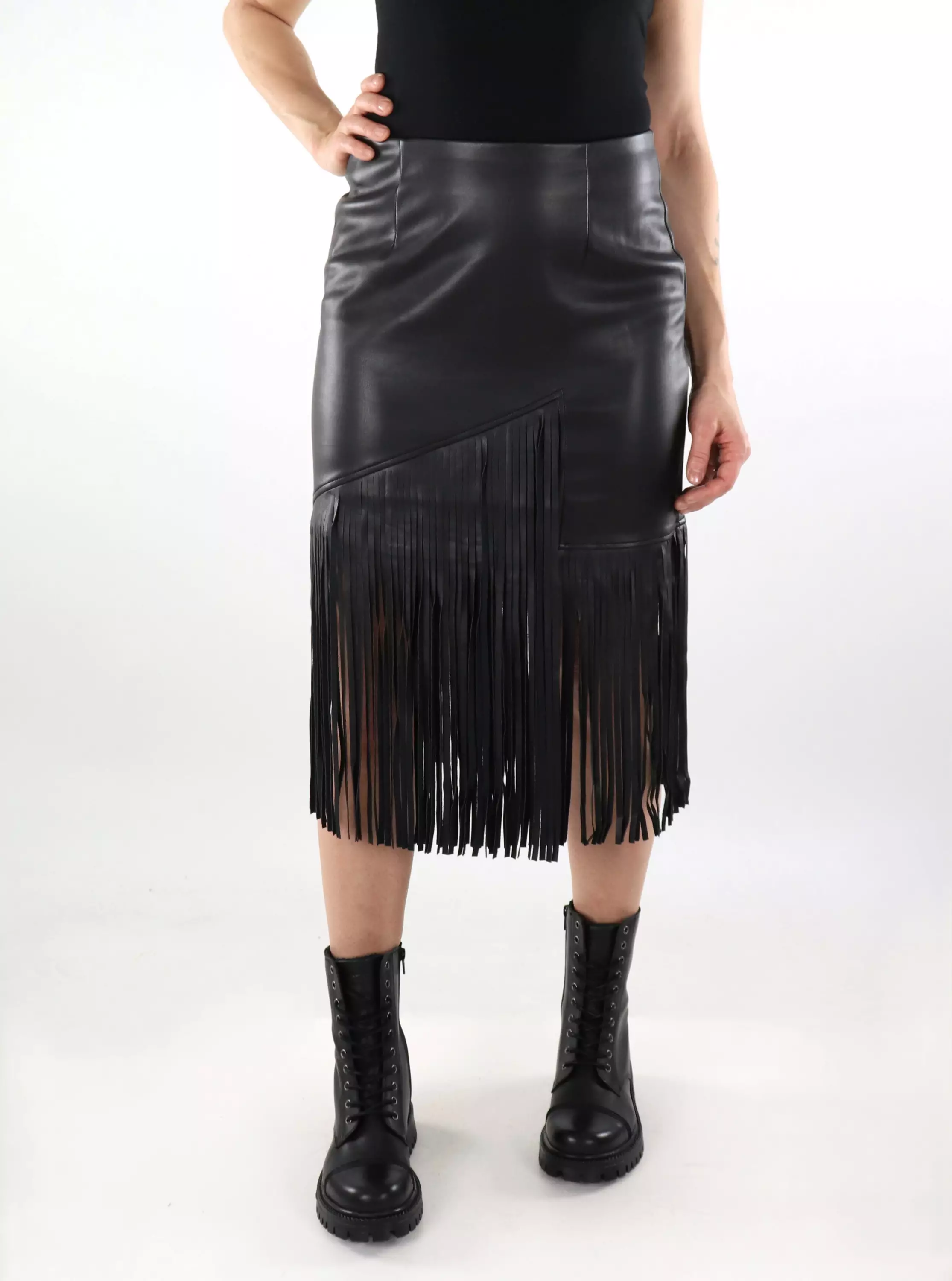 Trendig och stretchig kjol i konstläder med synliga fransar nertill!