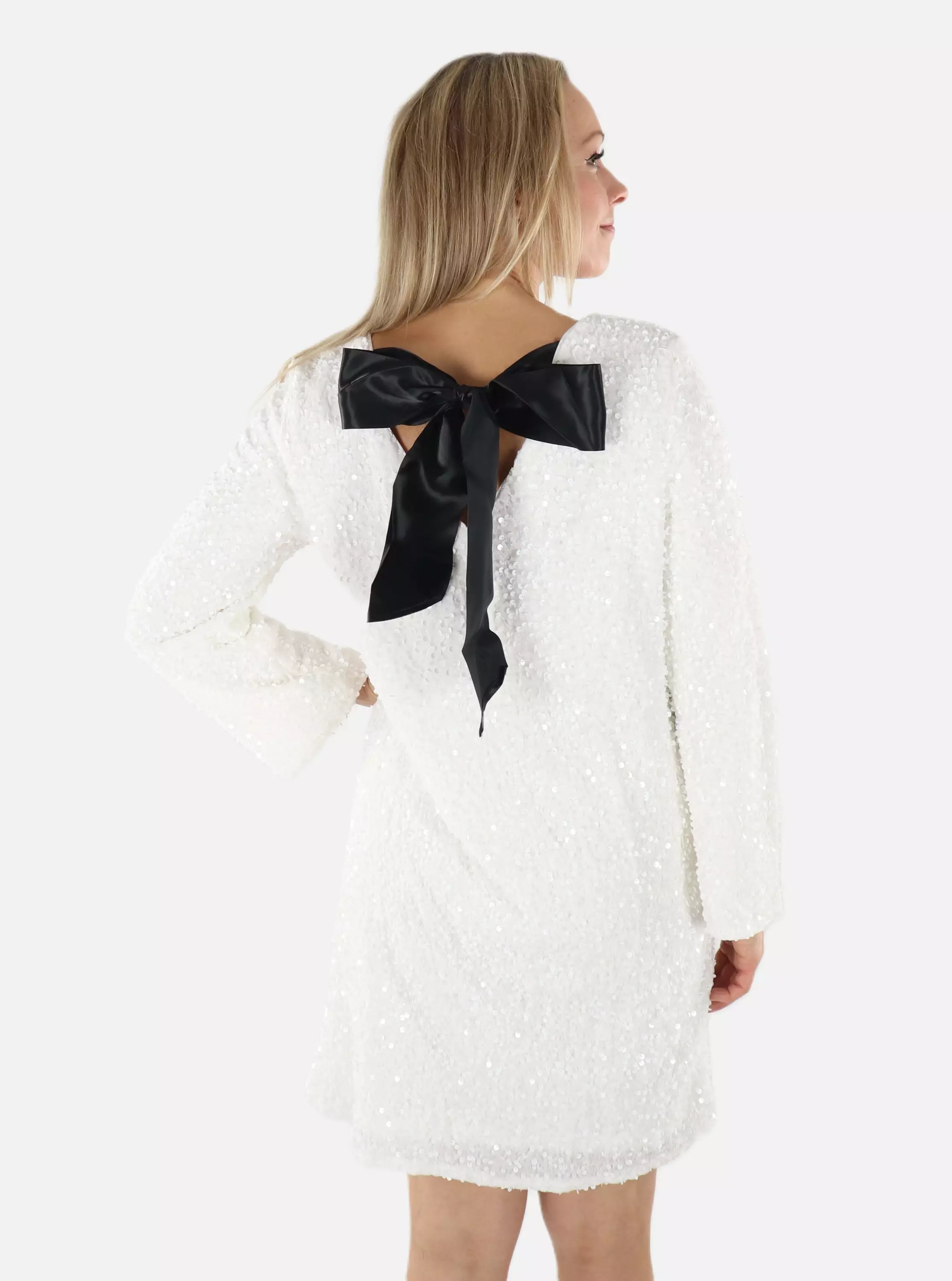 Vänd på huvudet med Vilas spektakulära paljettklänning, vars baksida är dekorerad med en vacker fluga!