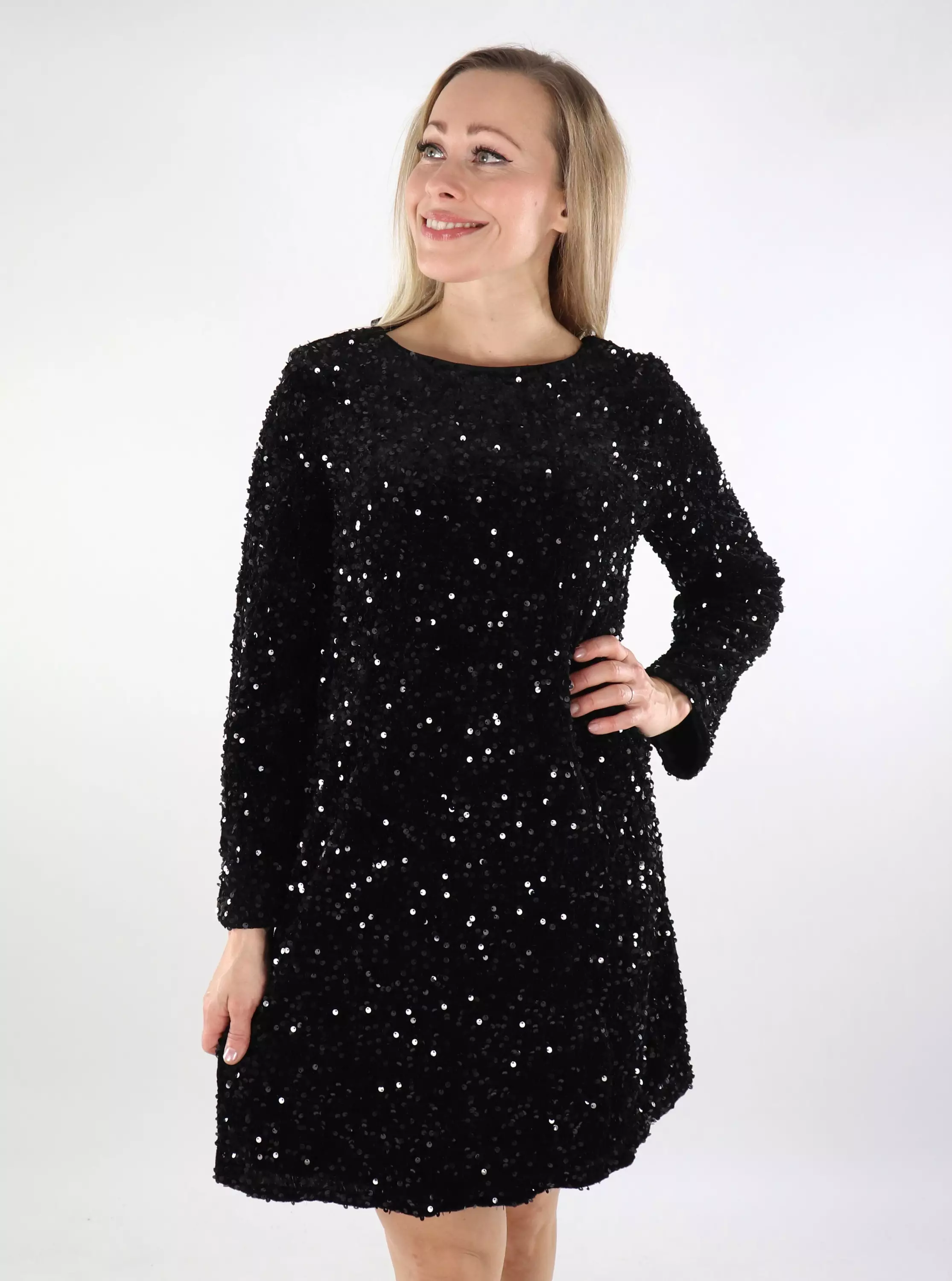 Vänd på huvudet med Vilas spektakulära paljettklänning, vars baksida är dekorerad med en vacker fluga!