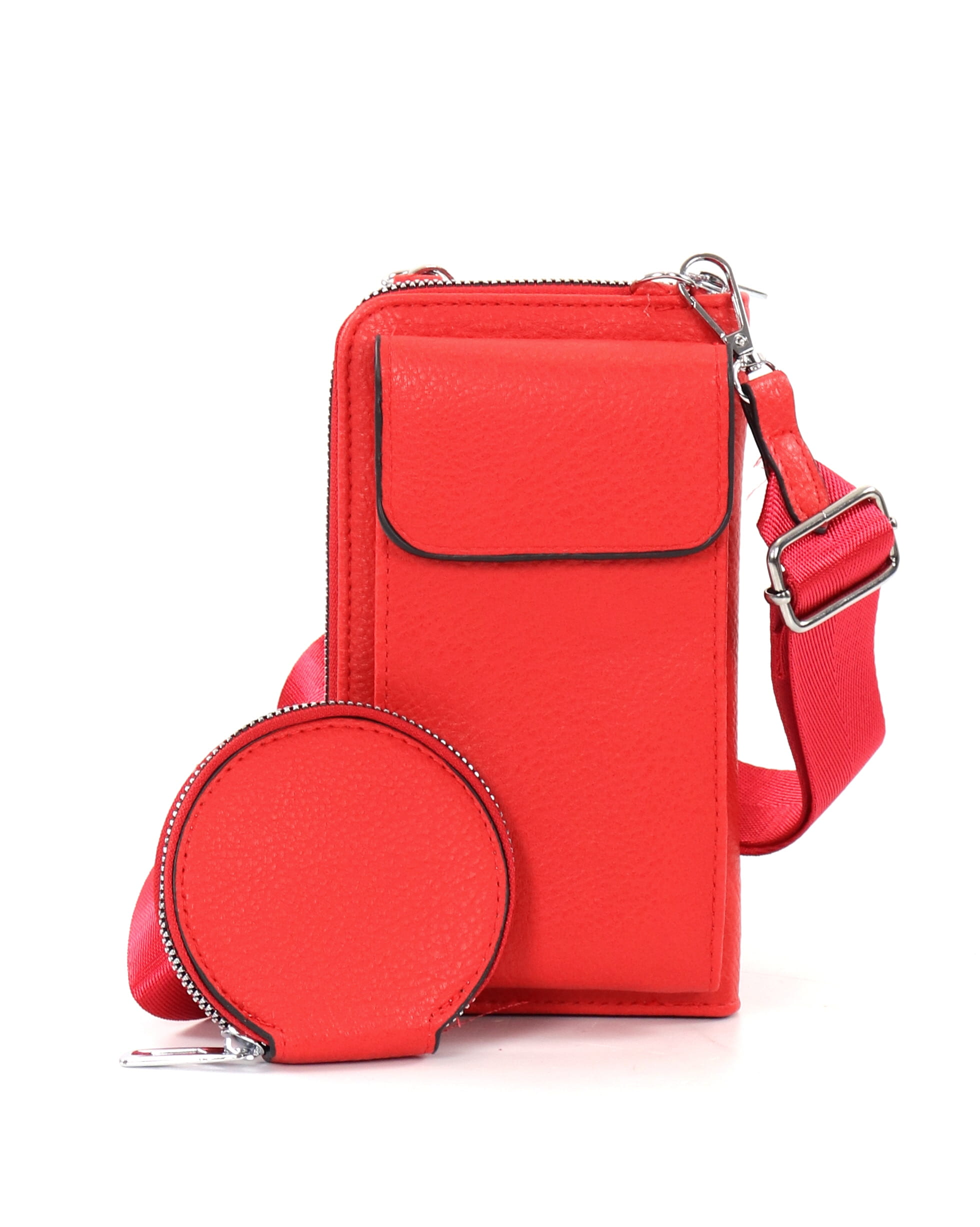 Liten axelväska av konstgjort material, med en myntficka fäst vid remmen. Utrymme inuti för fyra kort, en sedelficka, en ficka med dragkedja och två stora öppna fickor. Telefonficka på framsidan.